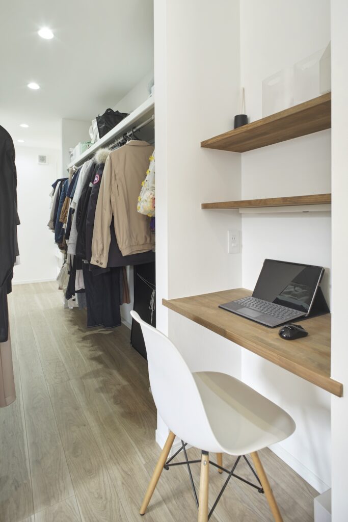 書斎スペースは、家族とつながるオープンな空間。木の味わいを感じながら、集中もしやすい環境を整えています。