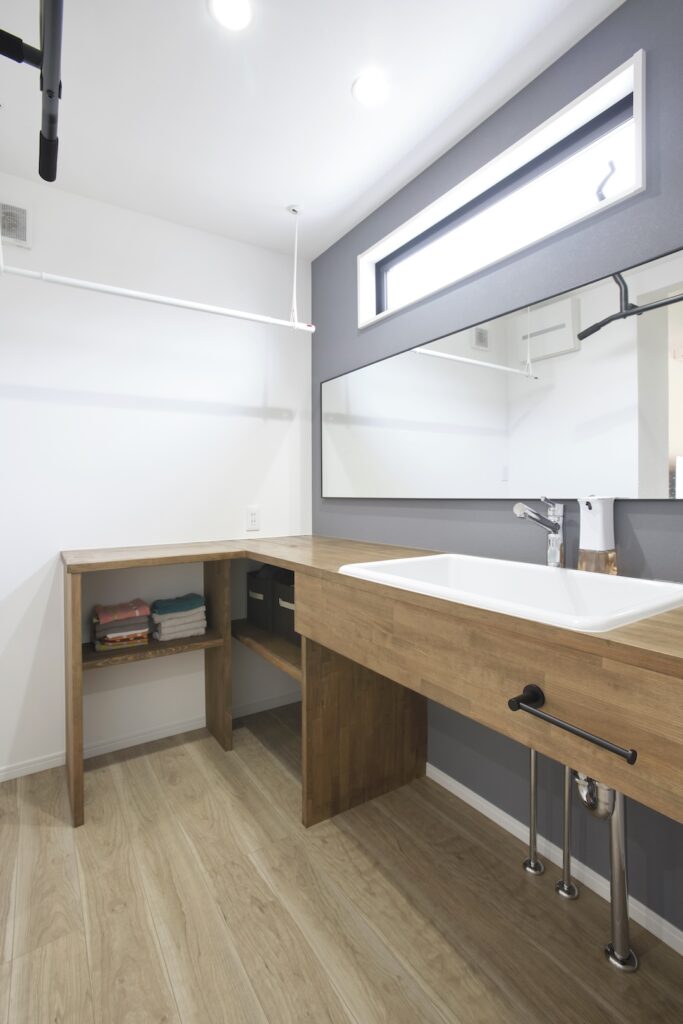 高窓から降り注ぐ自然光で明るい洗面脱衣室は、天板が長く朝の忙しい時間もラクラクな空間に。収納も充実しており、家事ラクな工夫が魅力です。