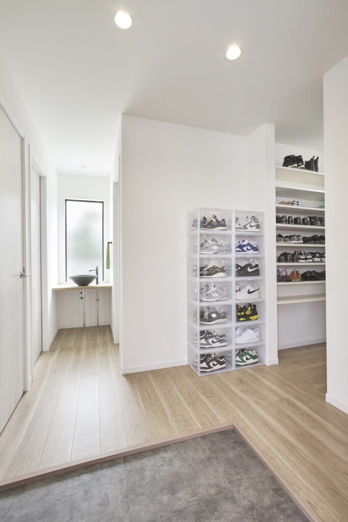 広々とした玄関ホールには、約1.5帖の収納を設置。靴やコートをスッキリ収納可能です。帰宅後すぐに洗面所にアクセスできる動線設計が特徴的で、日々の生活をより便利にしています。