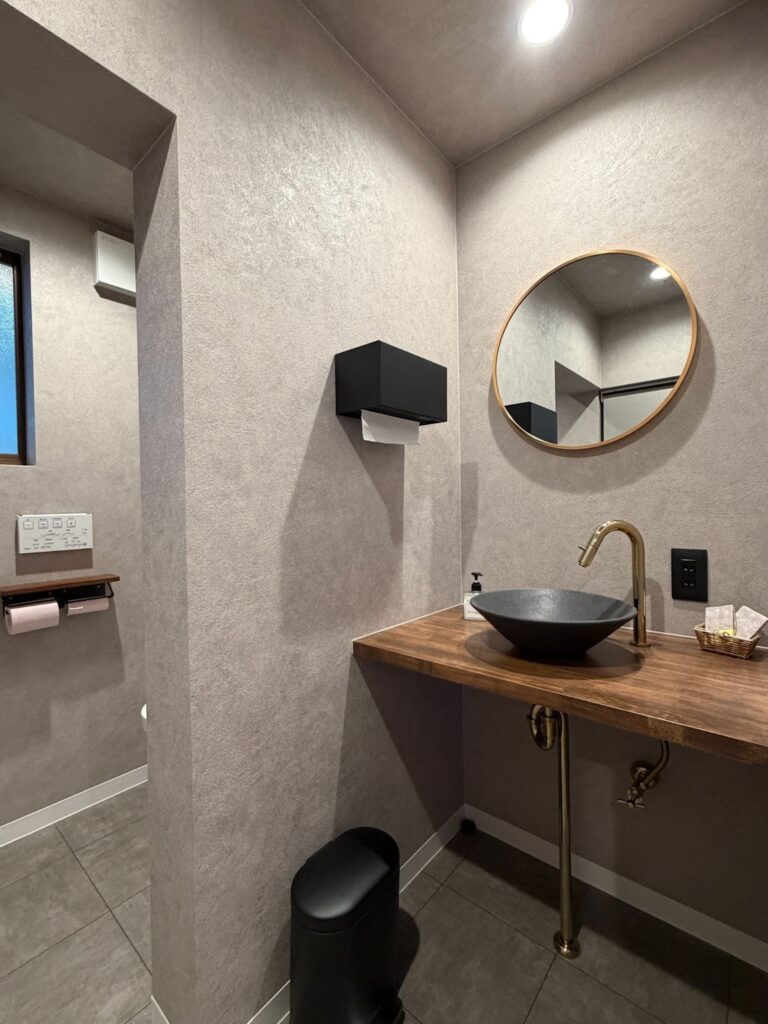 手洗い器をカウンター上に置くタイプ(ベッセル式)にすることで、デザイン性を高めています。お客様が使う空間だからこそ、細部までこだわりました。