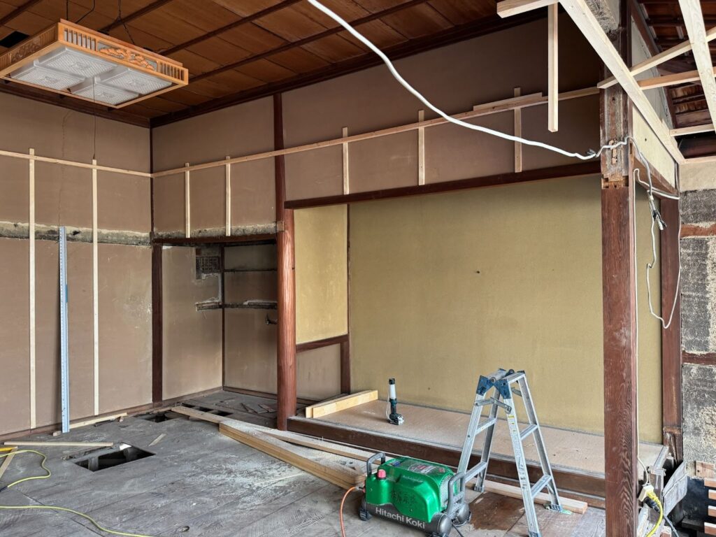 施工前は、畳の和室や木製建具、土壁などが残る典型的な古民家の室内。
