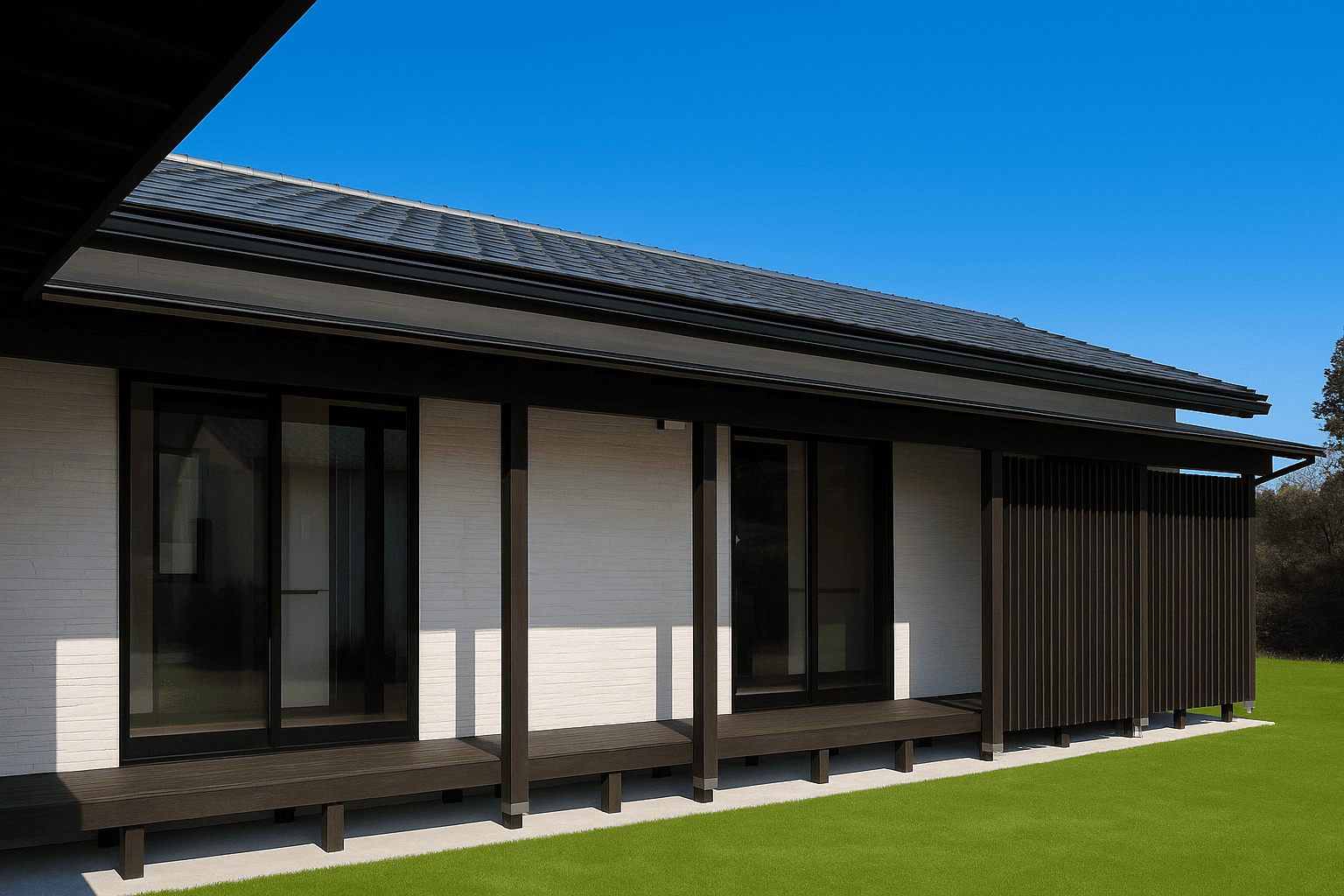 シンプルでありながら、深みのあるブラウンの格子が印象的な外観。ホワイトの外壁とのコントラストが際立ち、現代的でありながらどこか懐かしい佇まいです。<br />