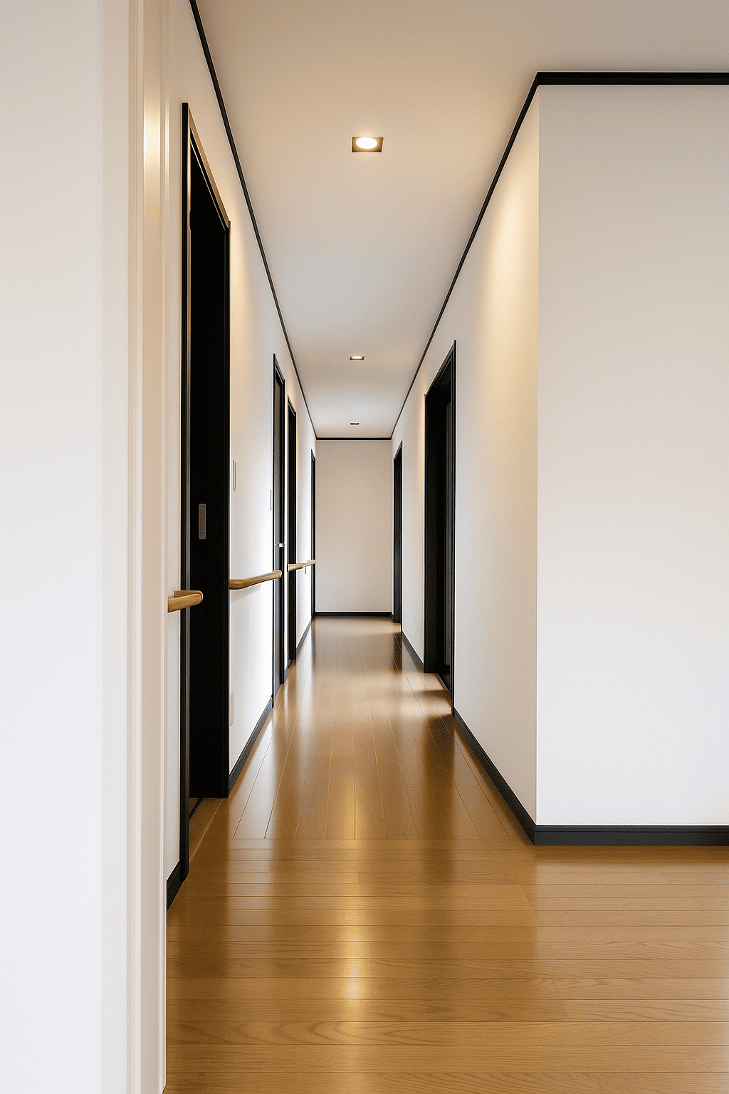 住まいの中心に配置された廊下は、家中を回遊できるストレスフリーな動線。段差を極力なくし、手すりも設けることで安全性にも配慮しています。<br />