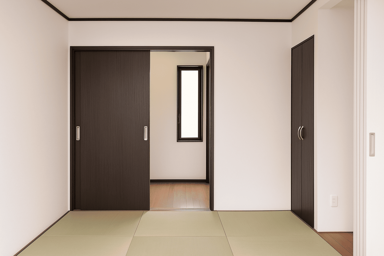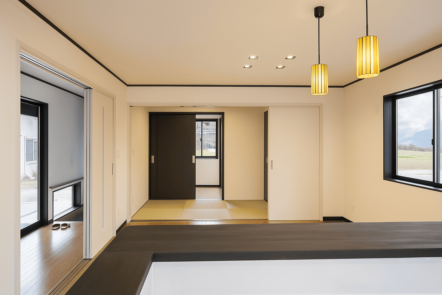 畳のやわらかな色味と木目の建具が、穏やかで落ち着いた雰囲気を演出。家族が集まり、ゆったりと過ごす時間にぴったりのスペースです。