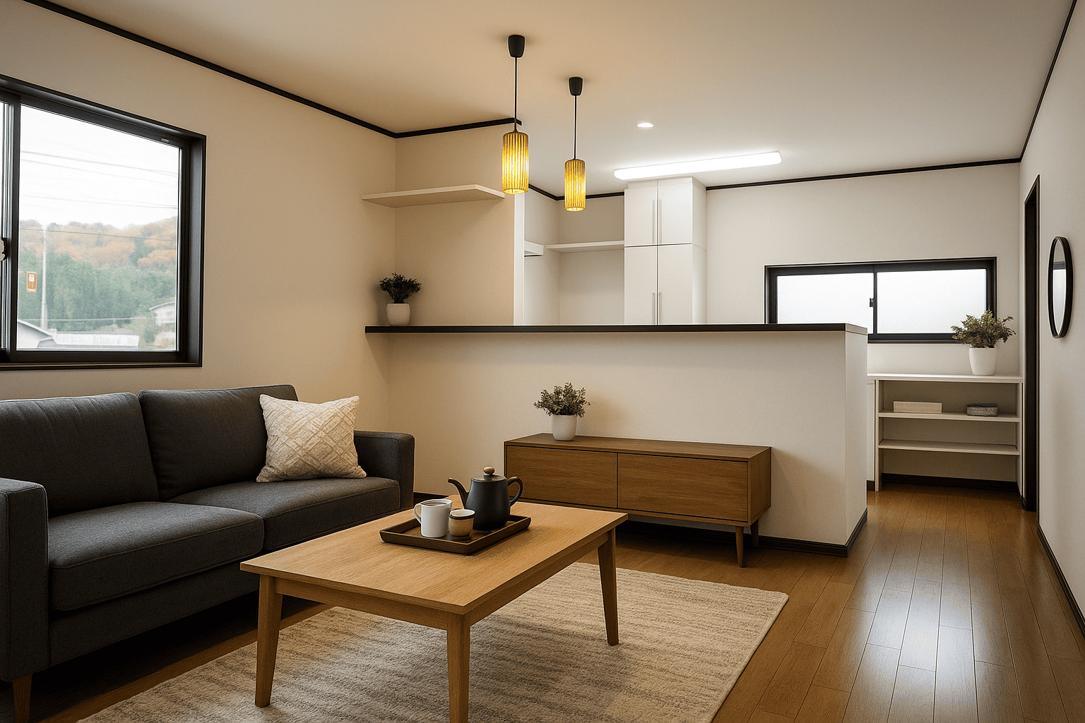 キッチンはカウンター付きのオープンタイプで、調理中も家族との会話が弾む設計に。収納棚も多く、見た目の美しさと機能性を両立しています。