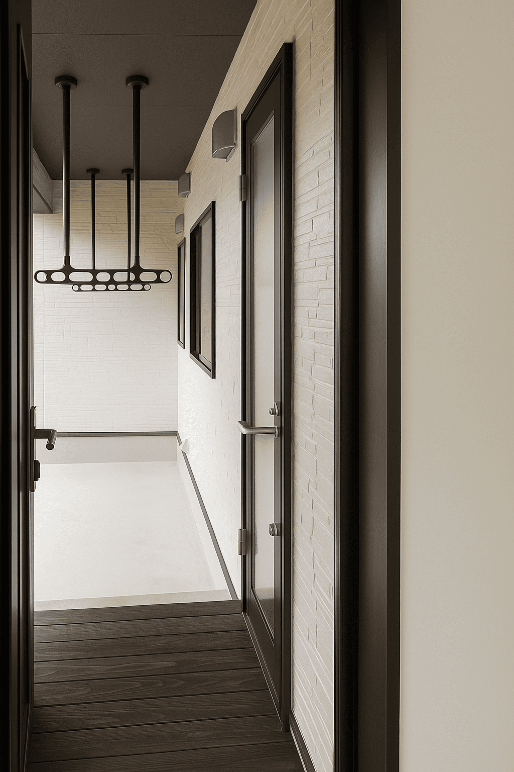 日々の家事を快適にするために設けられたバルコニー型ランドリースペース。屋根付きで天候を気にせず洗濯物を干すことができ、室内動線ともスムーズに連携。機能性とデザインを兼ね備えた、暮らし思いの設計です。