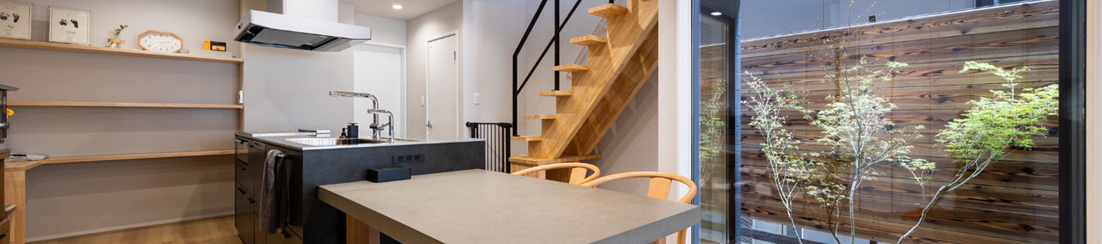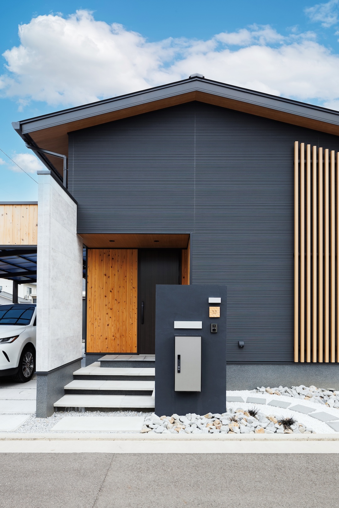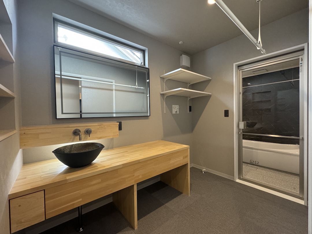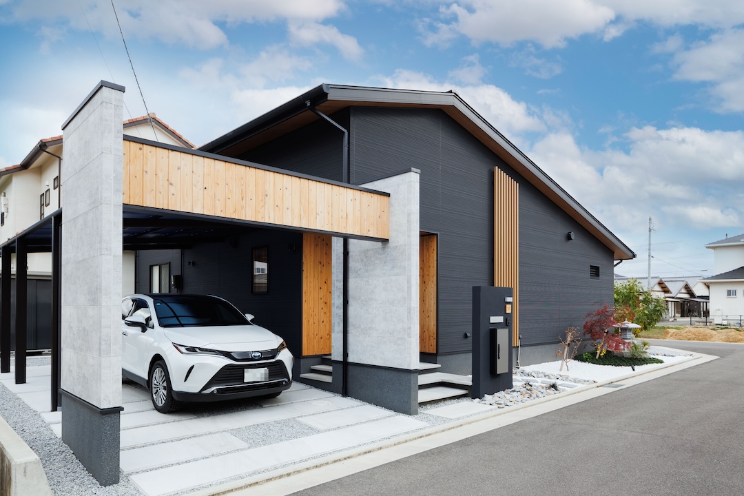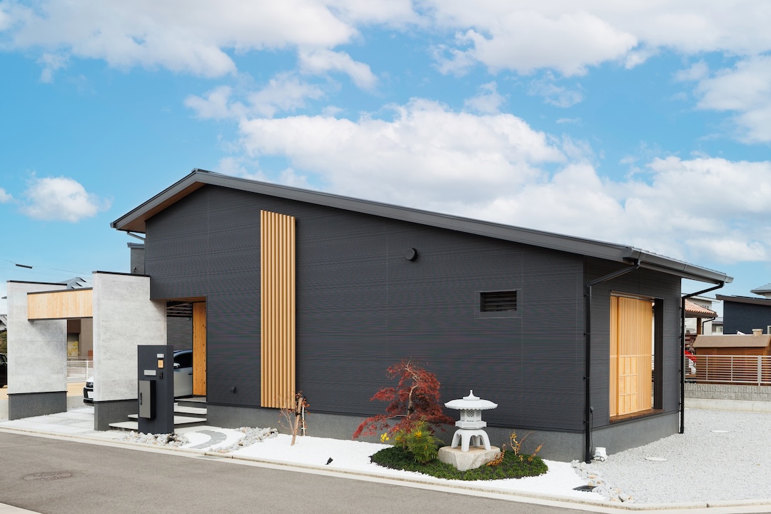 黒を基調とした外観に木格子が映える和モダンな平屋。玄関は木の温もりと陰影が美しい格子デザインでお出迎え。リビングはバーカウンターや囲炉裏付きのインナーテラスを備え、家にいながら非日常を楽しめます。キッチンは機能的かつ洗練されたデザインで、家族や友人が自然と集まる空間に。落ち着いた和のテイストと現代的な暮らしやすさを融合した、日常と特別な時間を両立できる住まいです。