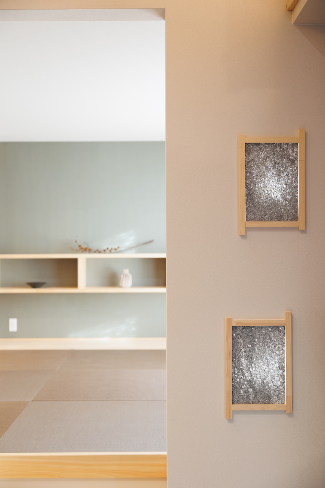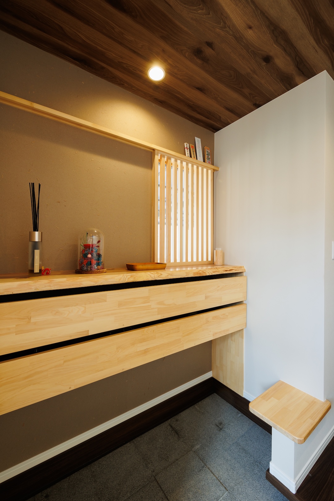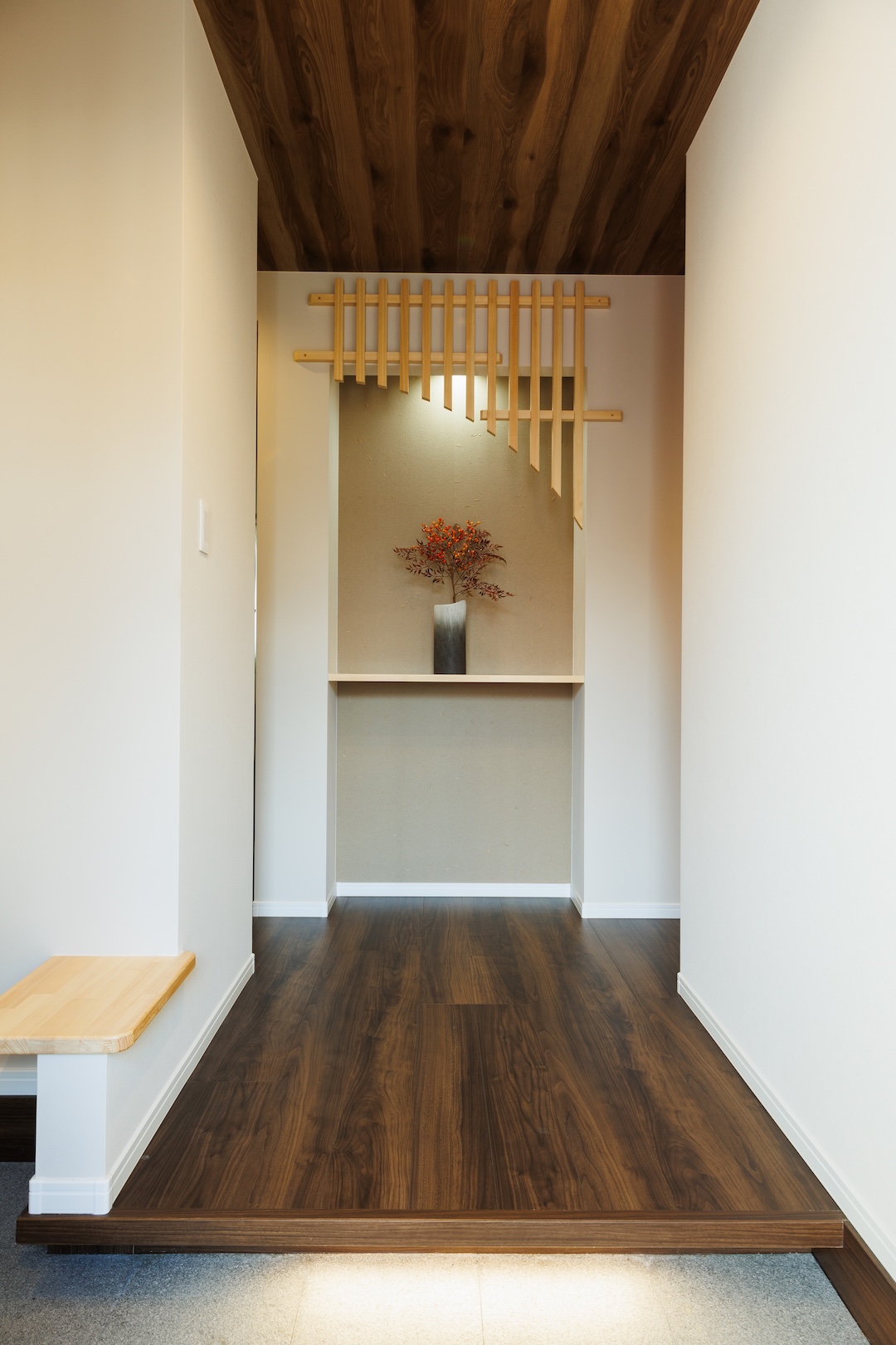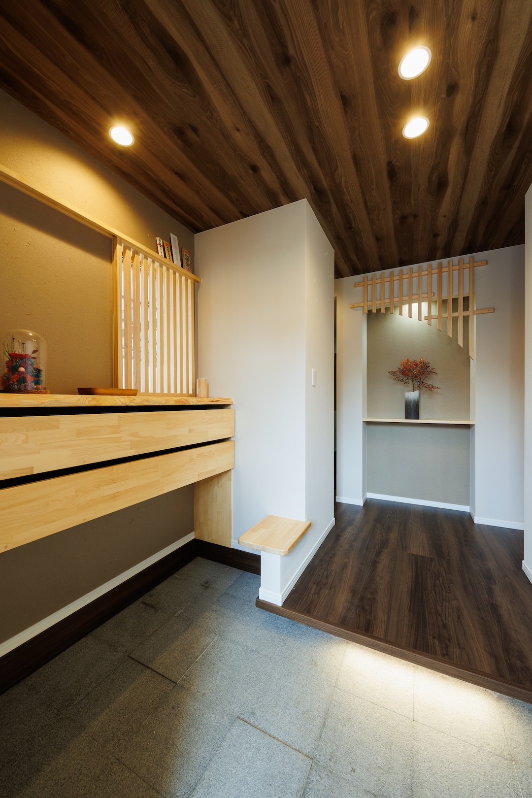 天井に深みのある木目をあしらい、壁の格子デザインと床の濃淡が空間に奥行きを与えた玄関ホール。正面の飾り棚には季節の枝物が映え、上質で落ち着いた雰囲気を演出。住まいに入る瞬間から特別感を感じられる上品な空間です。