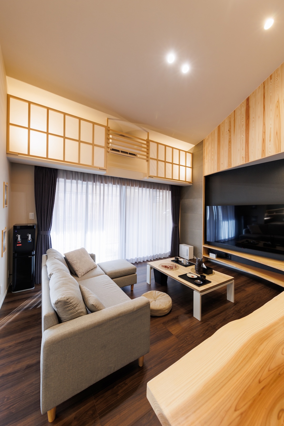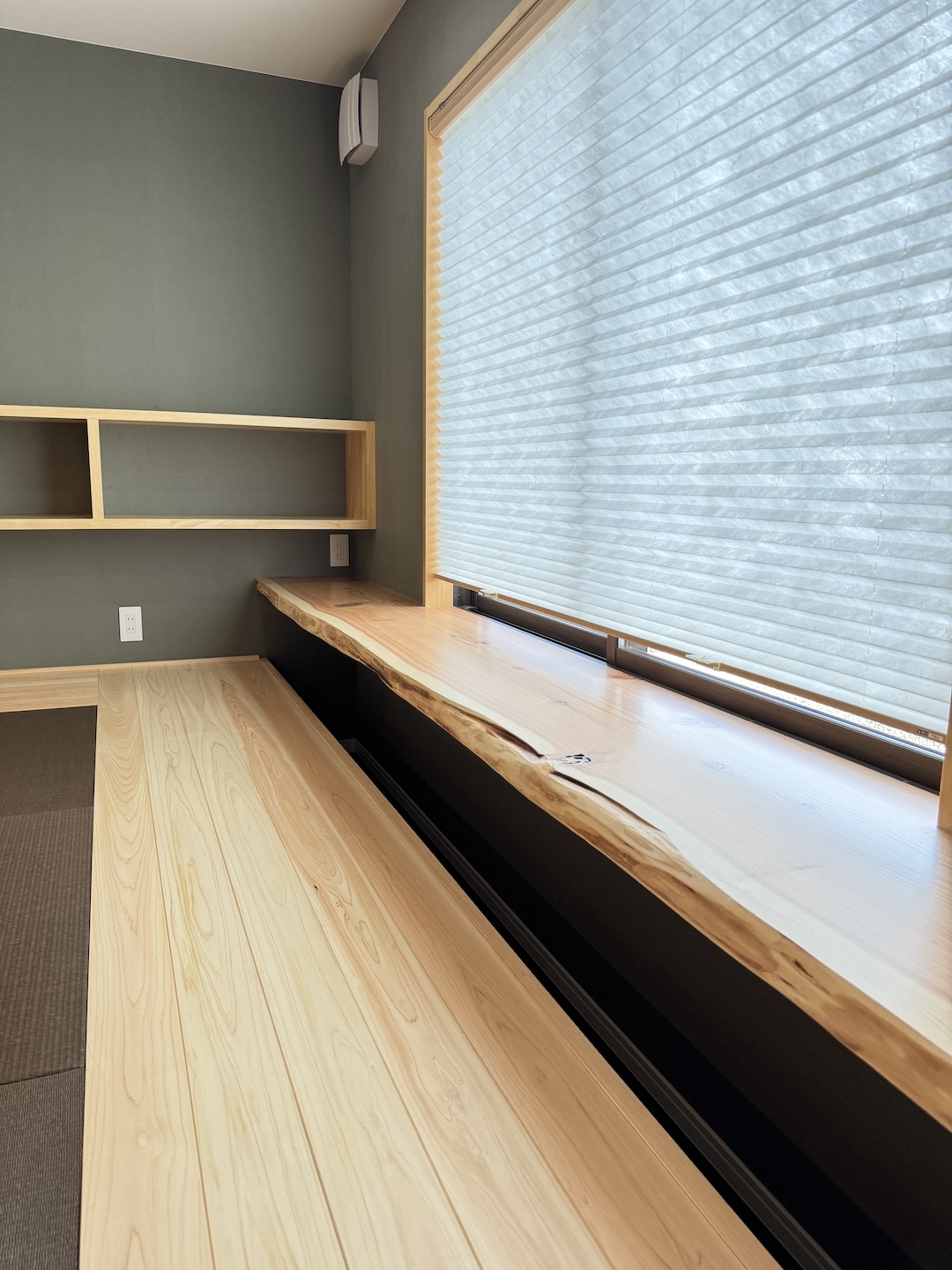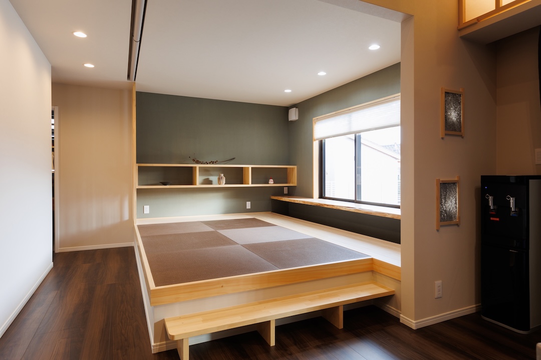 リビング続きに配置された小上がり和室は、客間や家族のくつろぎの場として多用途に活用可能。畳の落ち着きと木の温もりが調和し、窓際のカウンターは読書や子どもの学習スペースにも最適です。機能美と快適さを兼ね備えた空間です。