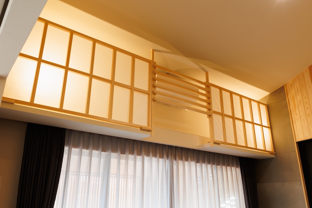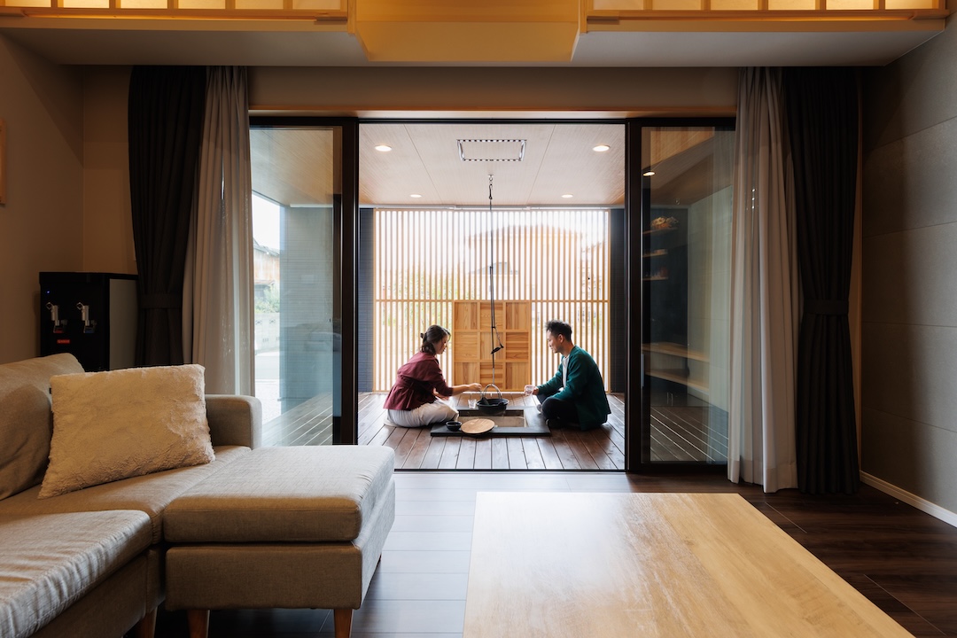 木製ルーバーで柔らかな光と風を取り入れた半屋外のウッドデッキ。中央には囲炉裏を備え、季節を問わず家族や友人と団らんを楽しめます。屋外にいながらもプライバシーが確保された、心安らぐ和モダンなアウトドア空間です。