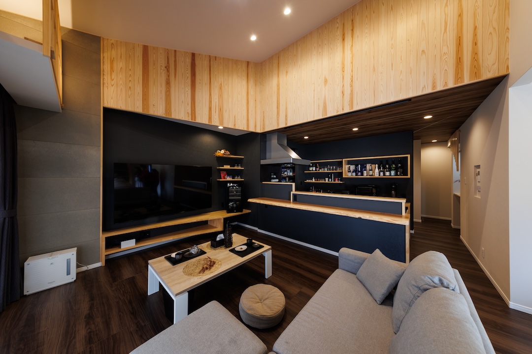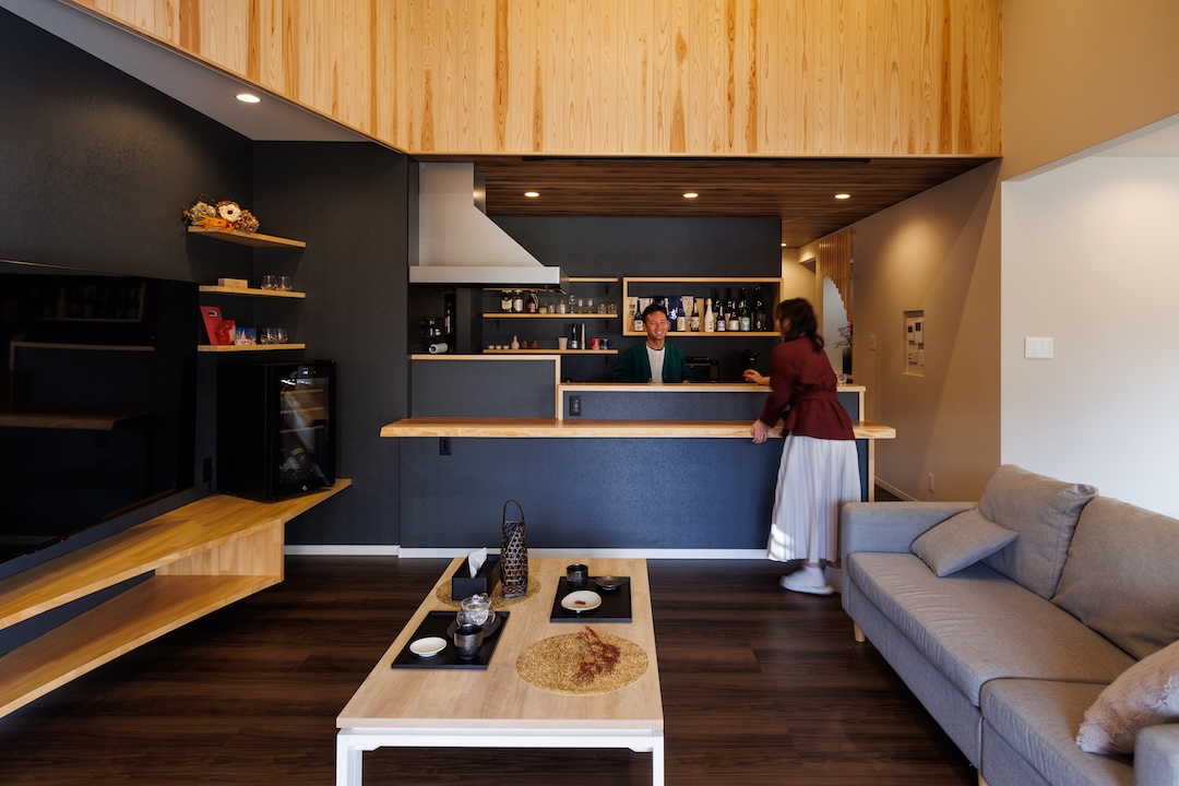 木の質感とダークカラーのコントラストが美しいリビング。キッチンにはバーカウンターを備え、家で過ごす時間を豊かに演出します。シンプルな家具配置により広々とした開放感があり、ゲストを招いても心地よくくつろげる空間です。
