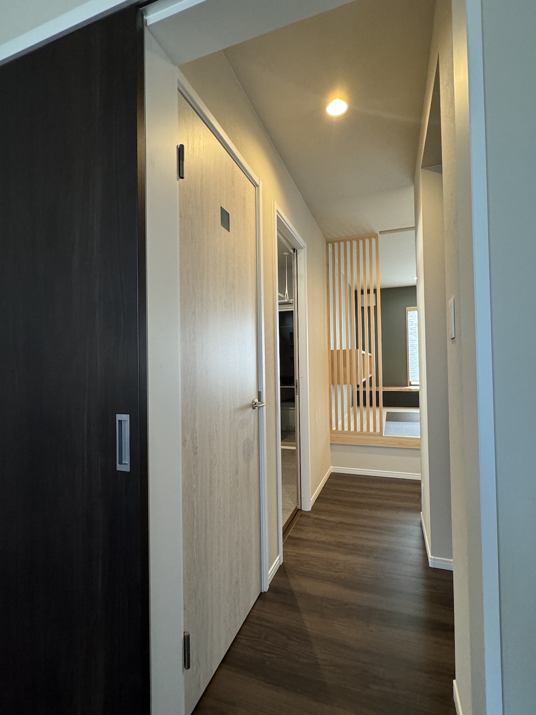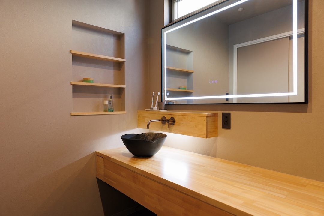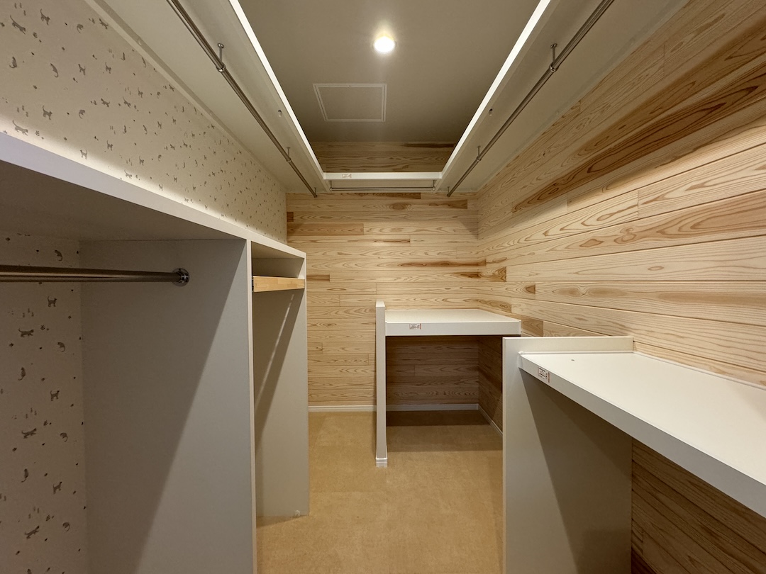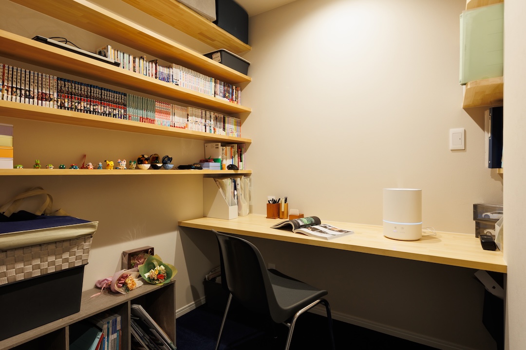 壁一面の可動棚と造作デスクを備えた書斎は、限られた空間を無駄なく活用。書籍や趣味のコレクションを整理しながら、自宅での仕事や学習にも集中できる落ち着いた環境。家族それぞれのライフスタイルに寄り添う便利なスペースです。