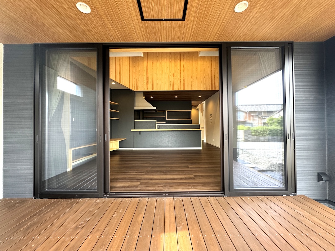 天井や床に自然素材の木をふんだんに使用し、室内と屋外がシームレスにつながる開放的なウッドデッキ。大きなガラス扉からは光がたっぷり入り、リビングとの一体感が生まれます。アウトドアリビングとして暮らしの幅が広がる空間です。