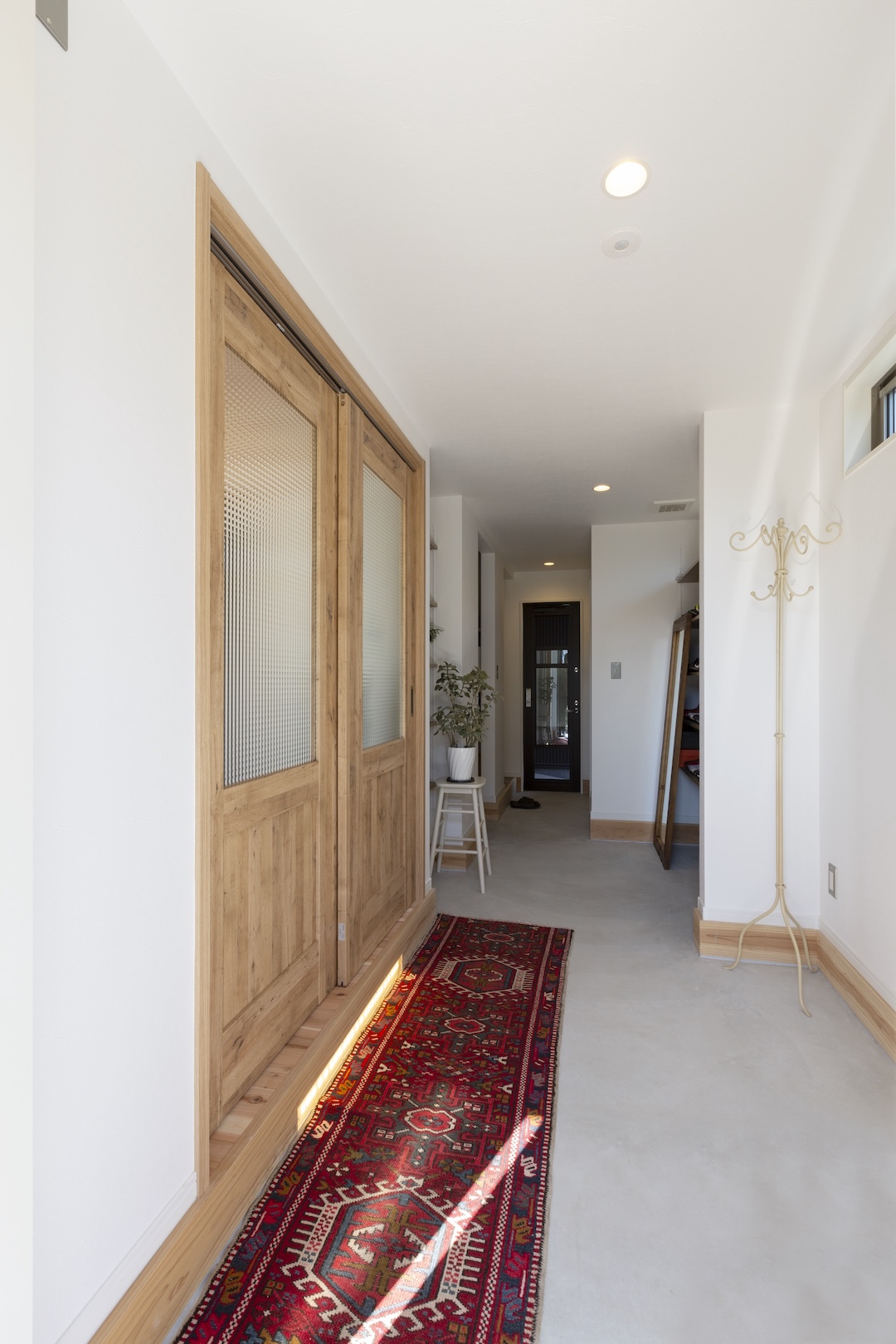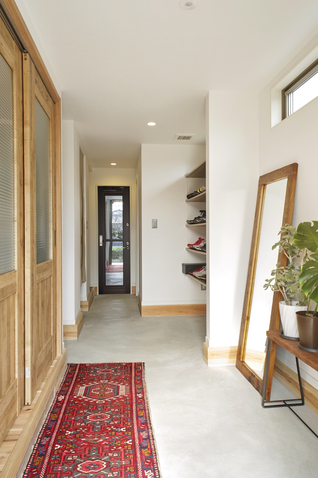 無機質なコンクリート土間と温かみのある木目を組み合わせた玄関ホール。赤いヴィンテージラグが空間のアクセントとなり、スタイリッシュながらも温もりを感じる雰囲気です。壁面のシューズラックや姿見、グリーンの配置がシンプルな中に暮らしの個性を引き立てています。