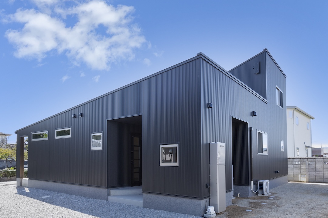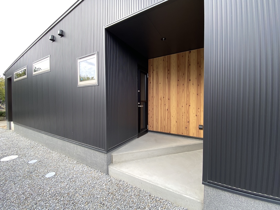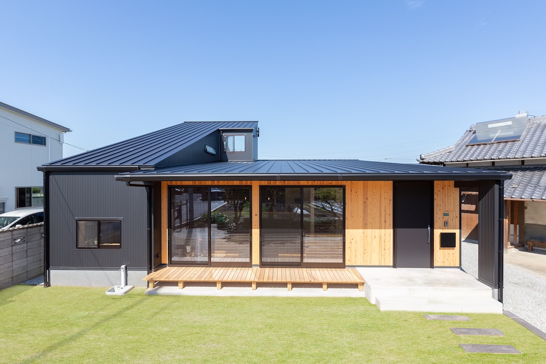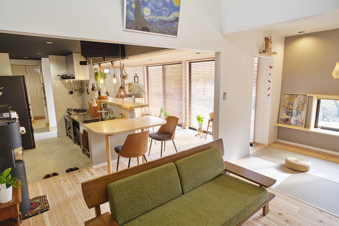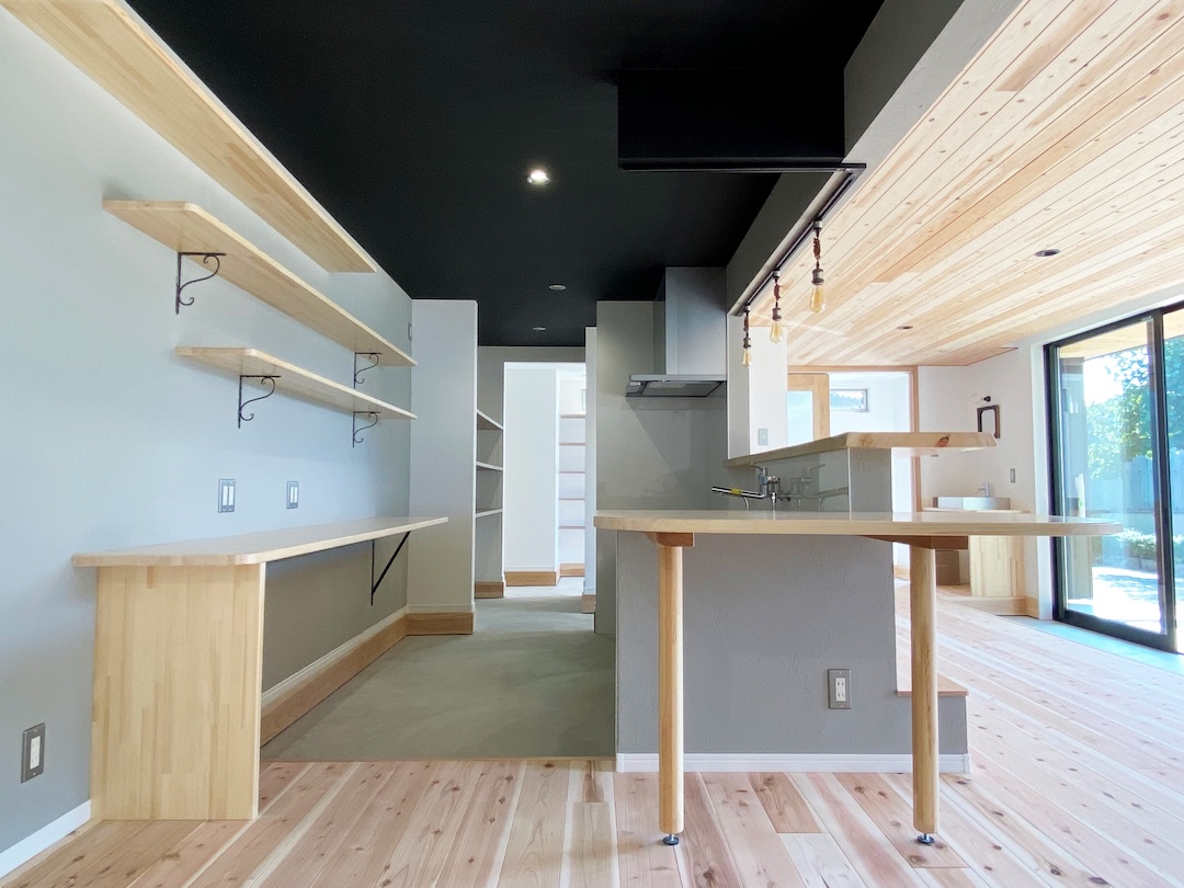 黒ガルバリウムと杉板張りのコントラストが美しい外観が印象的な平屋住宅です。室内は無垢の木をふんだんに使用し、カフェのようなカウンターや見せる収納棚が暮らしを楽しむ空間を演出。大きな窓からは明るい陽射しが差し込み、土間リビングや畳スペースが開放感と落ち着きを両立しています。階段横には趣味のギターや本をディスプレイできる棚も備え、家族のライフスタイルが映し出された住まいです。