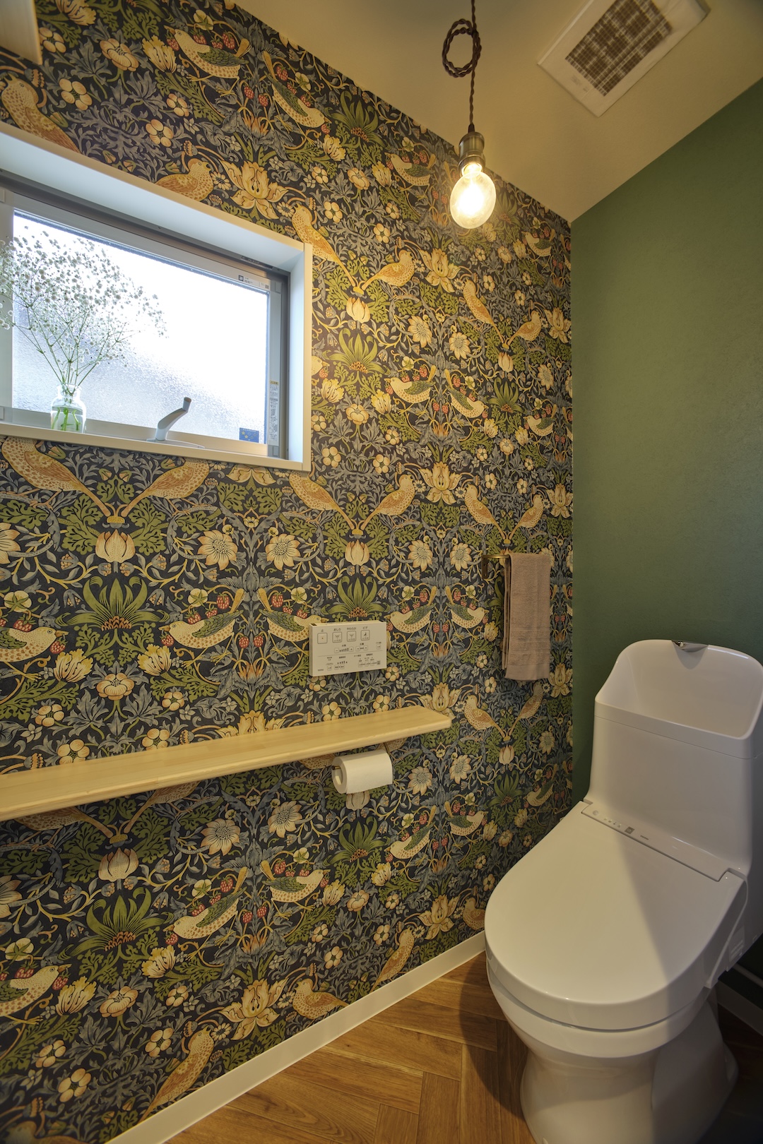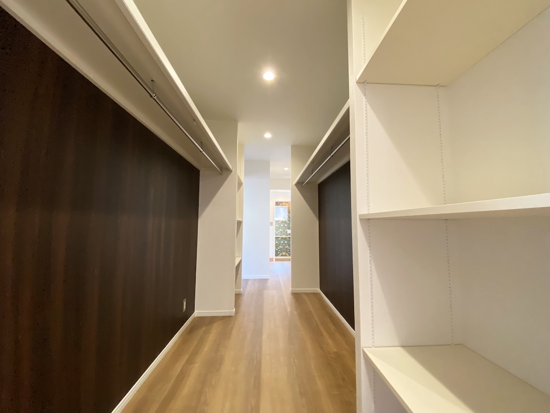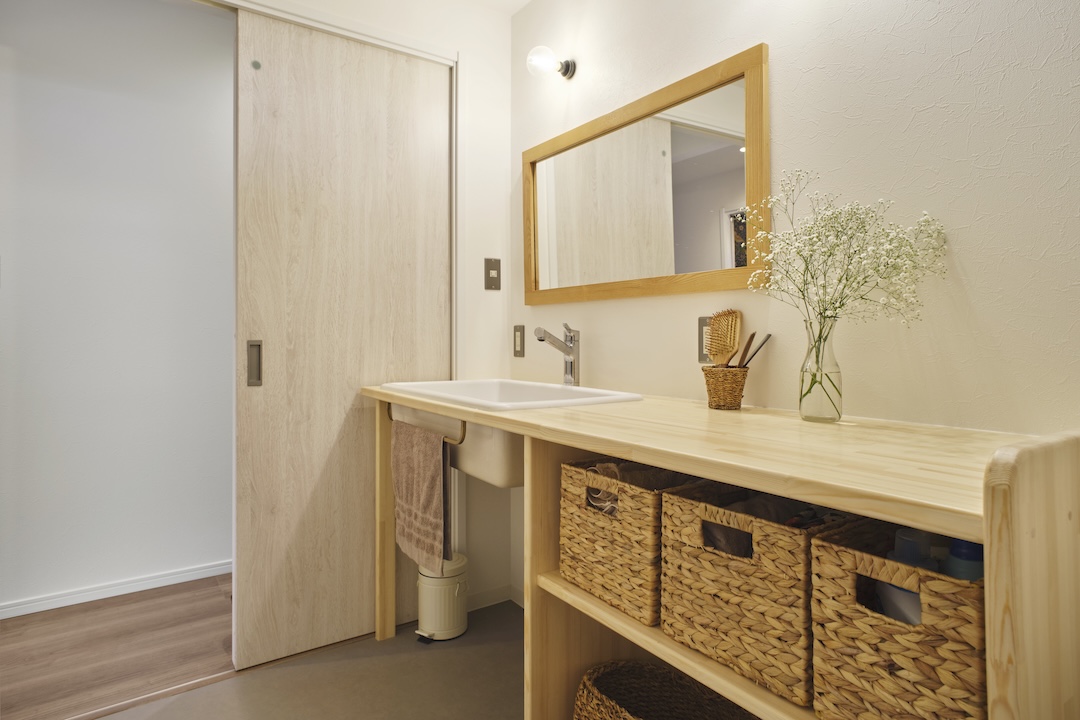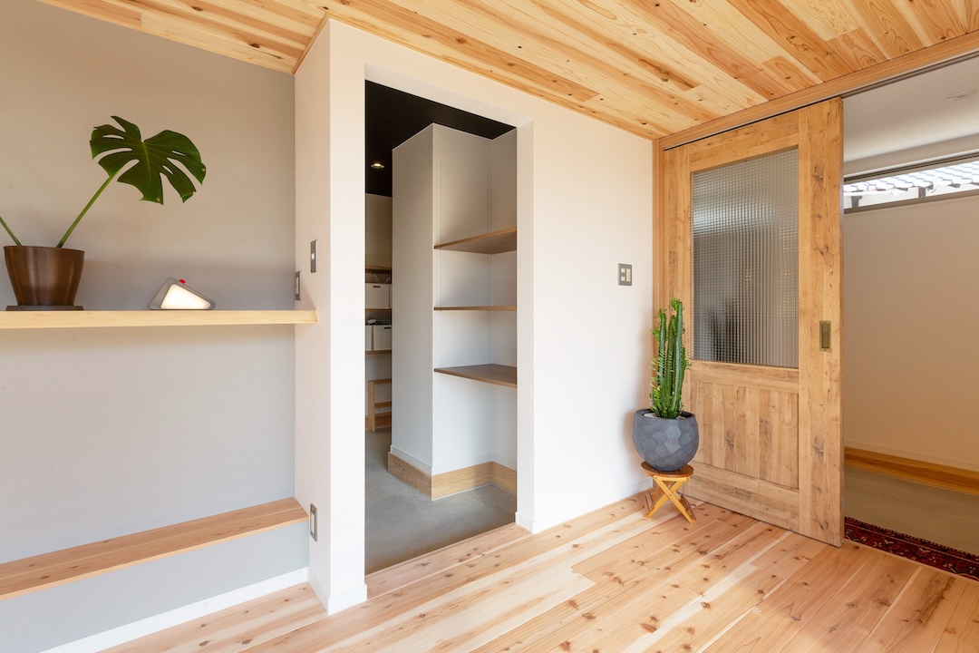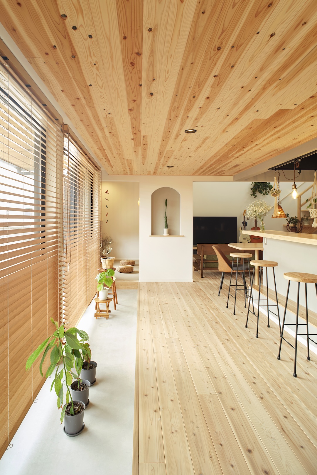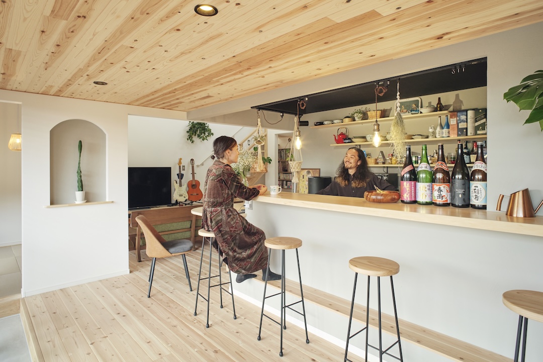 木の温もりを感じるカウンターキッチンは、まるで自宅の中に小さなカフェをつくったような心地よさ。天井まで木目で統一し、温かみと落ち着きのある空間を演出しています。飾り棚やペンダントライトがアクセントとなり、お酒や小物をディスプレイできるのも魅力。家族や友人と語らいながら過ごせる特別な時間がここから生まれます。