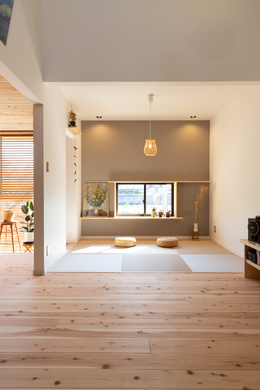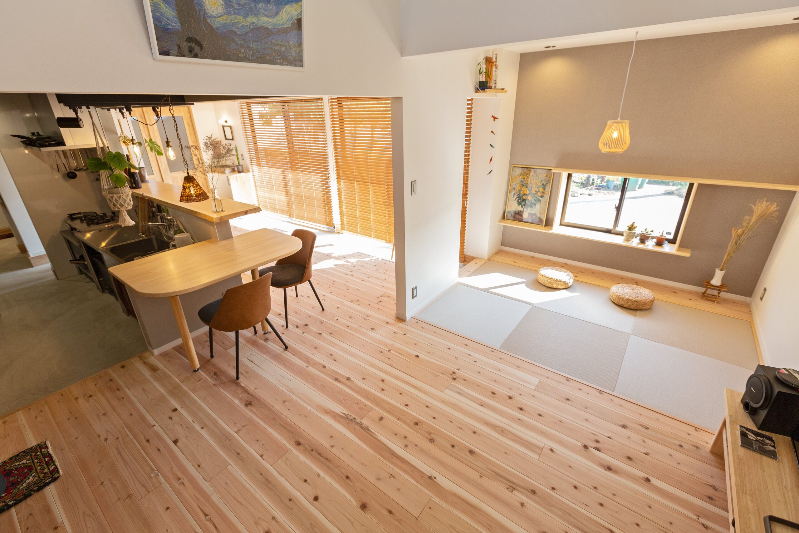 カフェ風のキッチンカウンターとリビングが緩やかにつながるLDK。大きな窓から差し込む自然光と木目の天井・床が温かみを演出し、くつろぎの時間を豊かに彩ります。畳スペースがほどよい和の落ち着きをプラスし、家族の憩いの場にぴったりな空間です。