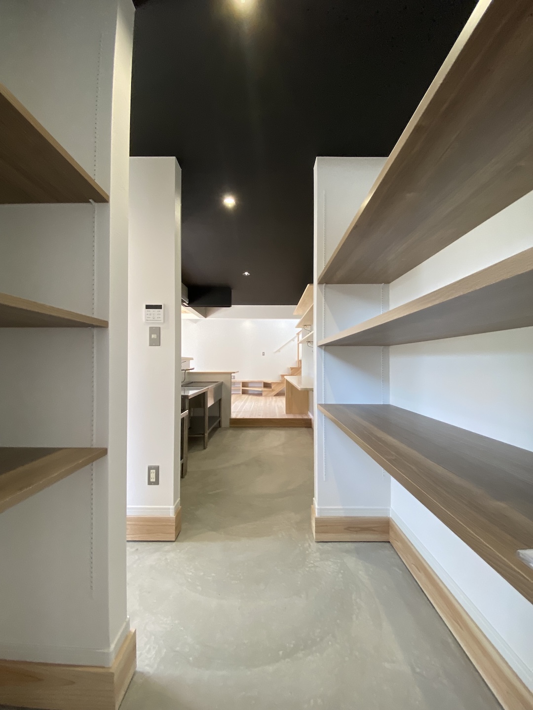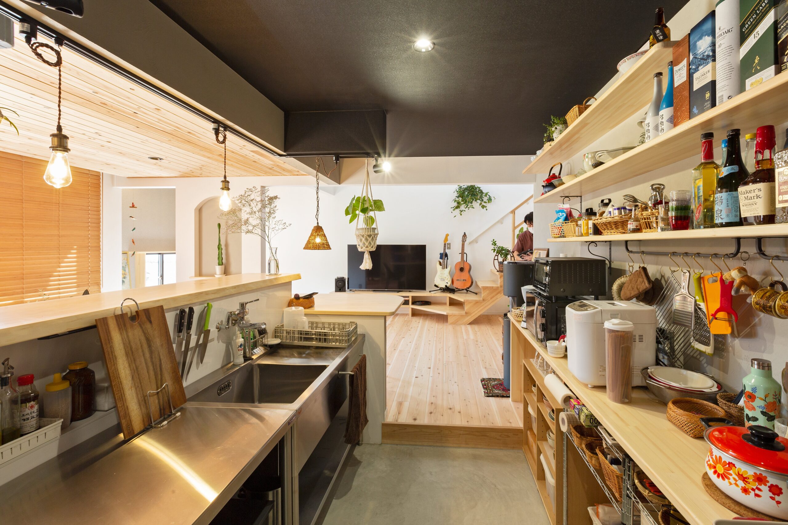 木の温もりが広がるカウンター越しにリビングを望むオープンキッチン。ステンレスの作業台と見せる収納棚がプロ仕様の雰囲気を演出しつつ、家族や友人との会話も弾む心地よい空間。暮らしに彩りと機能美を両立したキッチンです。