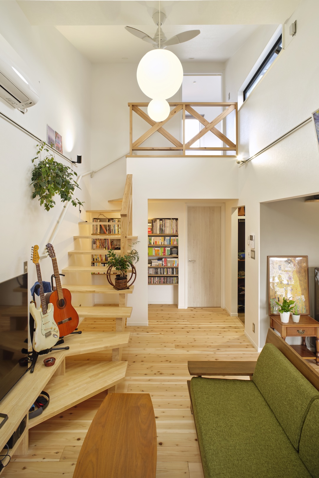 吹き抜け天井とシーリングファンが明るく心地よい空気を運ぶリビング。木目が美しいスケルトン階段は軽やかで空間を広く見せ、下部の収納棚が機能性もプラス。階段横の書棚が家族の趣味を彩り、温もりと実用性が融合したリラックス空間です。
