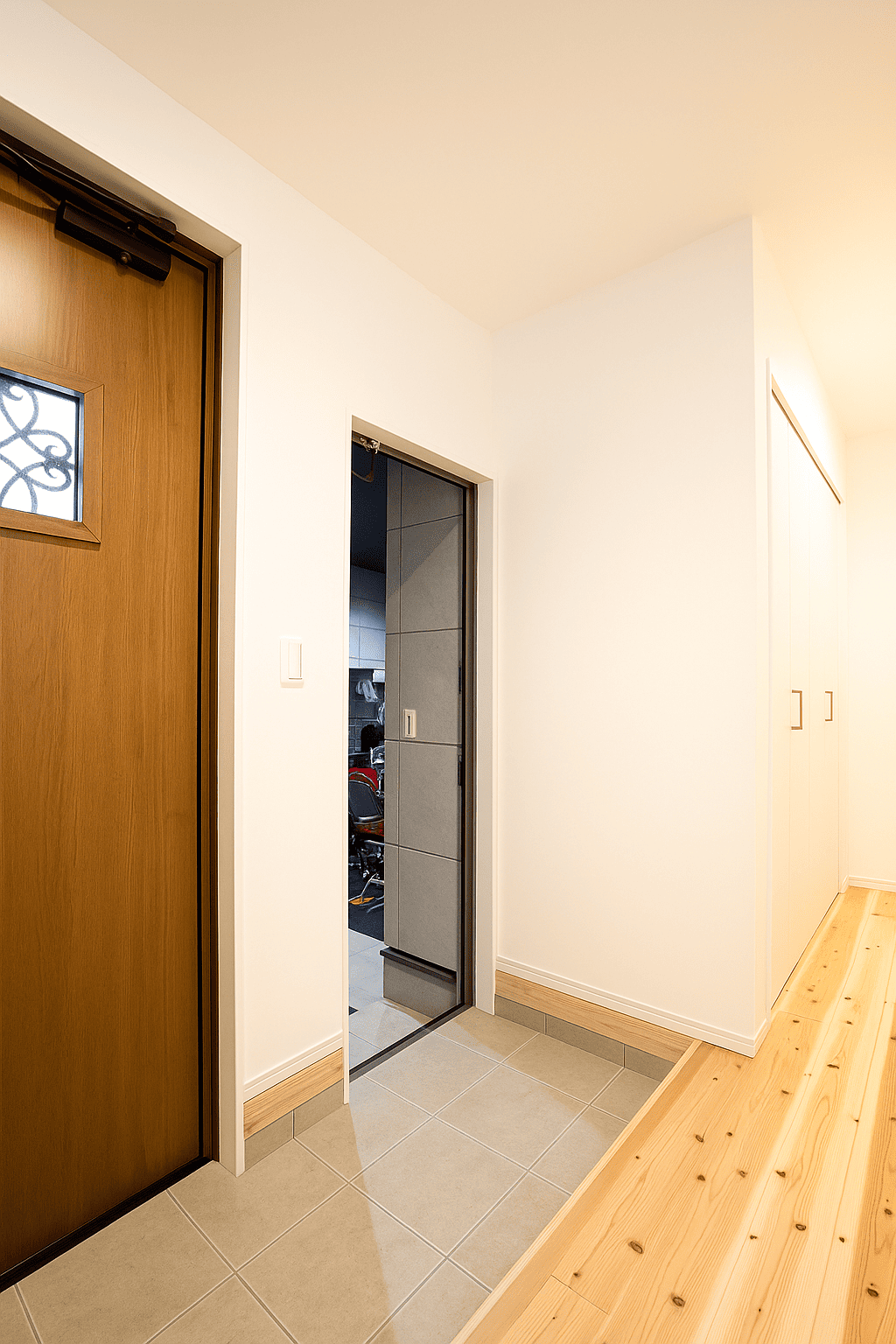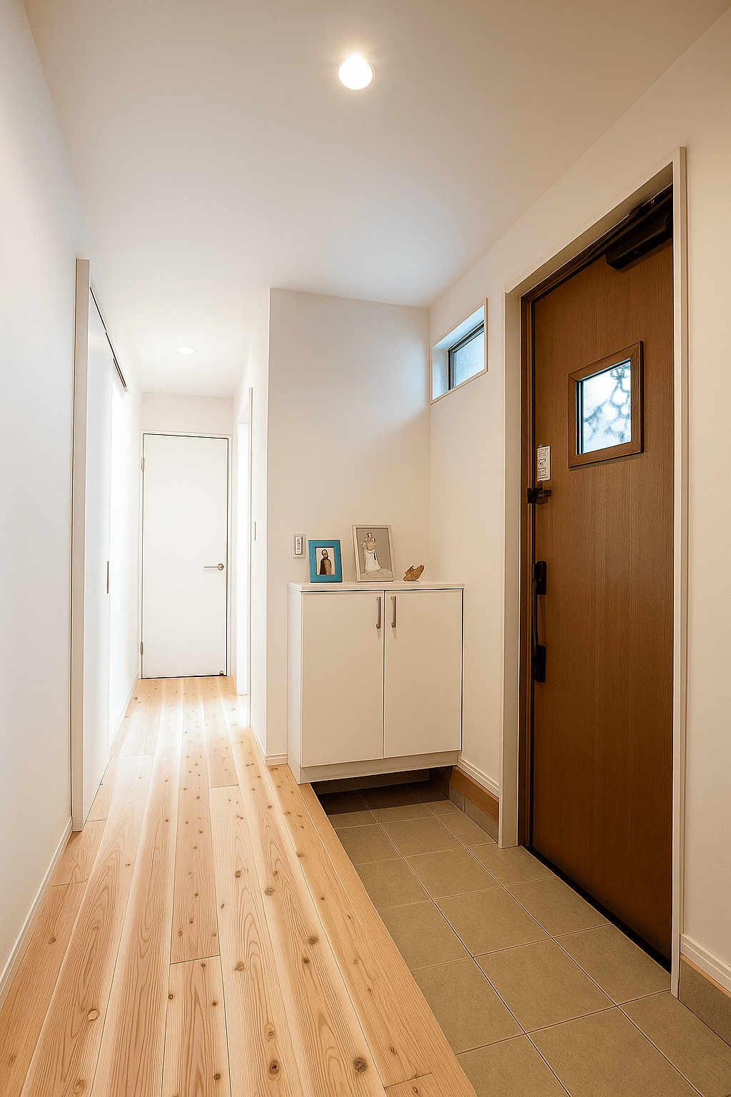 無垢のフローリングが優しい木の香りと温もりを感じさせる玄関は、白を基調とした壁と組み合わせることで、明るく清潔感のある空間を演出しています。コンパクトながらも収納をしっかり確保し、靴や小物をスッキリ整理。小窓から差し込む自然光がやわらかな表情を添え、家族や訪れる人を心地よく迎え入れます。シンプルながらも素材の質感を活かした、毎日の暮らしにやさしく寄り添う玄関です。
