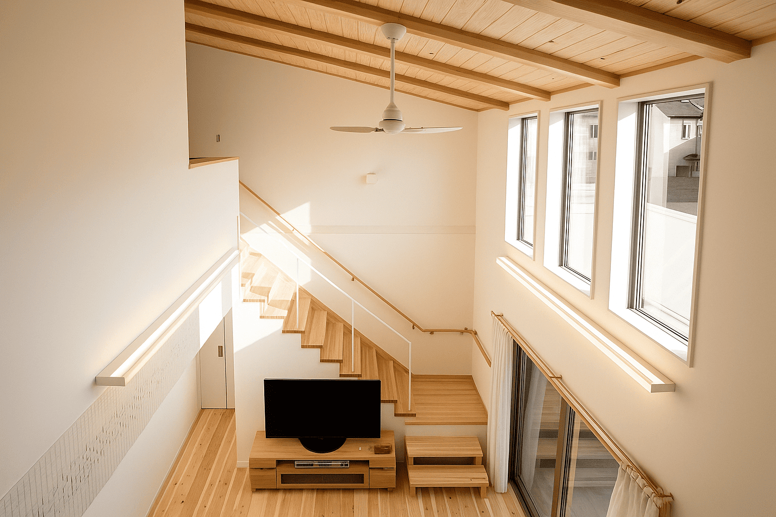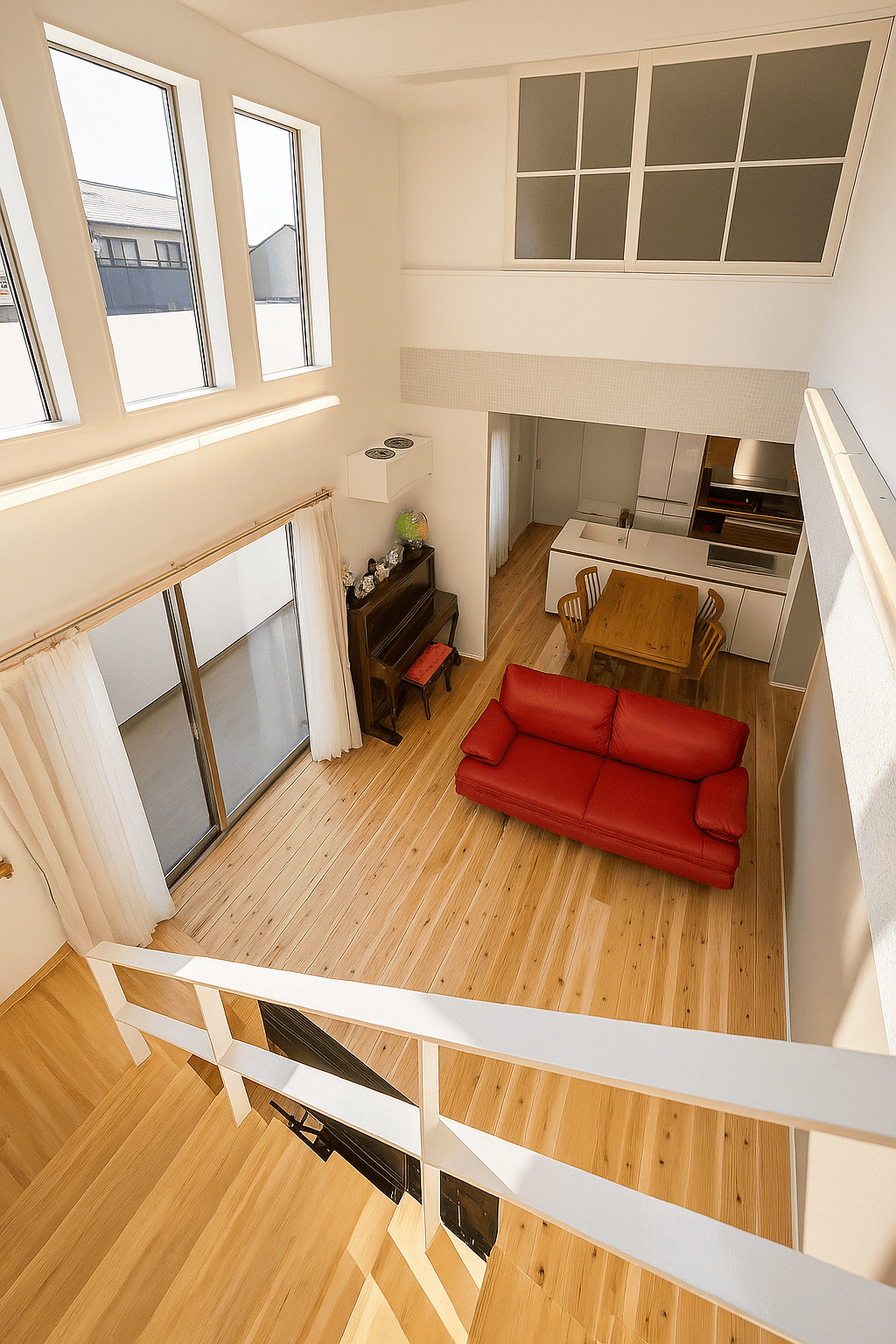 大きな縦長窓からたっぷりと自然光が差し込み、明るく心地よい空間を生み出す吹き抜けリビングです。2階のフリースペースと緩やかにつながり、家族の気配を感じながらも開放感のある暮らしを実現。無垢材の床が温もりを添え、赤いソファが空間のアクセントに。上下階のつながりが生む一体感と光あふれる快適さが魅力です。