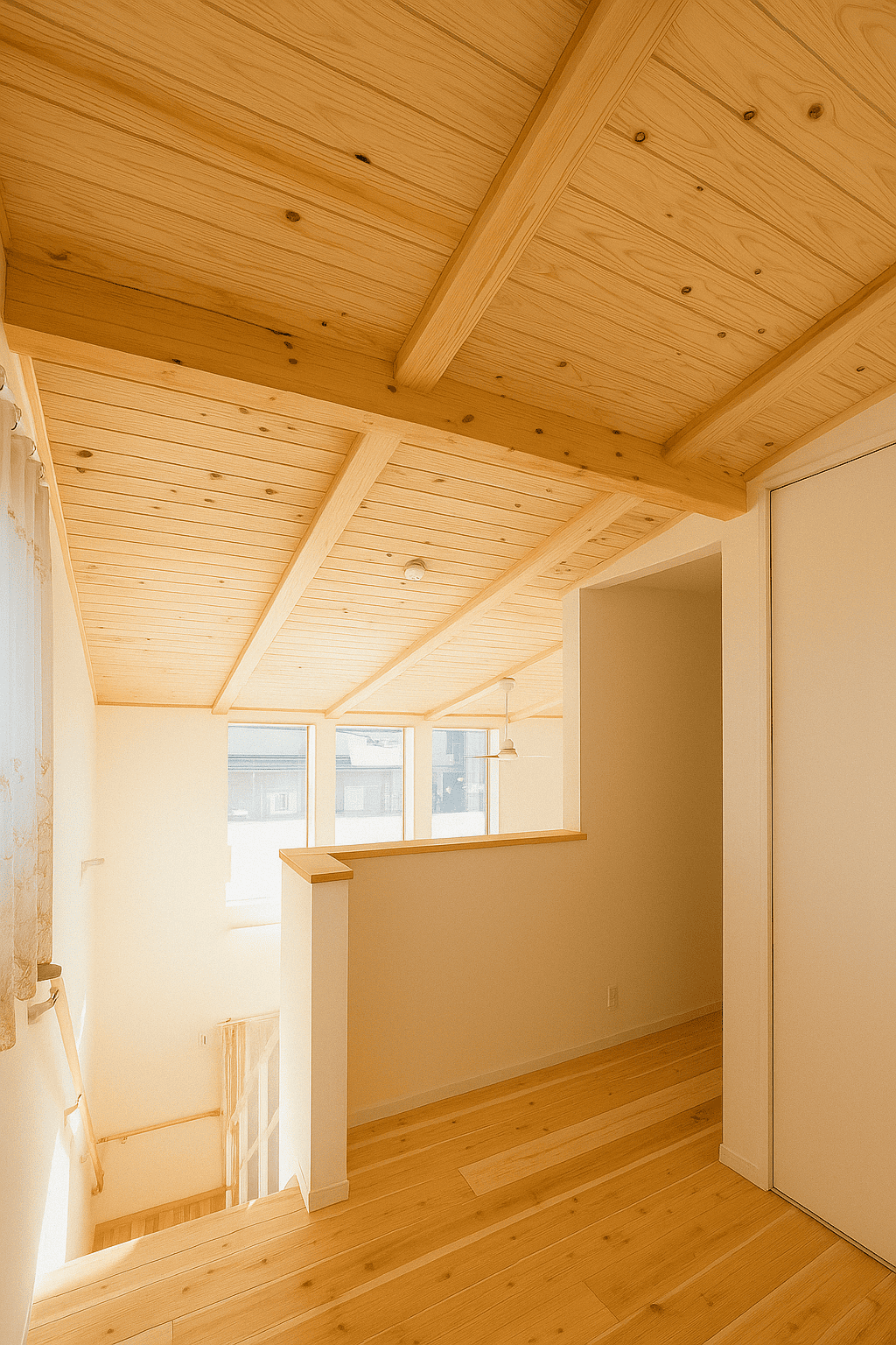 天然木の天井と床が温かみのある雰囲気を演出し、窓から注ぐたっぷりの自然光が明るく心地よい空間をつくり出しています。吹き抜けのリビングとつながるこのフロアは、家族の気配を感じながらも落ち着いて過ごせる多目的なスペース。読書やワークスペースとして活用できるほか、開放感とやさしい木の香りが家全体に癒しを届ける心地よい居場所です。