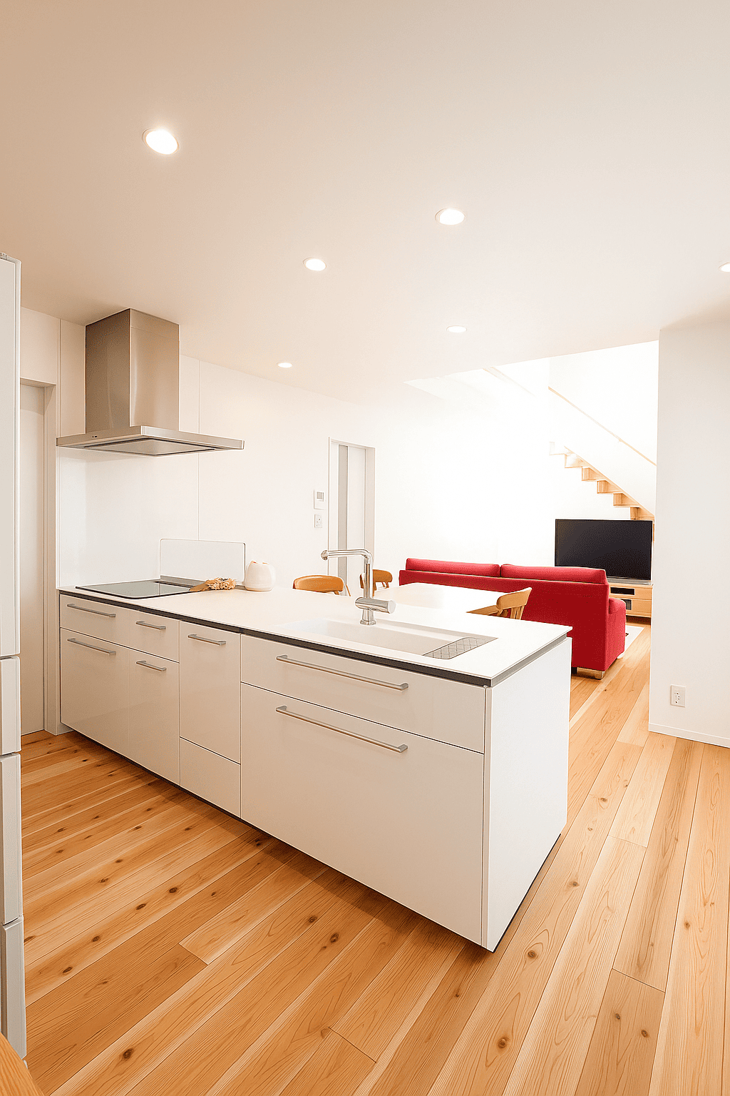 白を基調とした清潔感あふれる対面キッチンは、ダイニング・リビングへと視線が抜ける開放的な配置が魅力です。家事をしながら家族との会話が弾み、調理や配膳の動線もスムーズ。背面収納はすっきりとしたデザインで空間を広く感じさせ、無垢の床材が温もりをプラスします。料理の時間が家族との心地よいひとときに変わる、暮らしの中心となるキッチンスペースです。