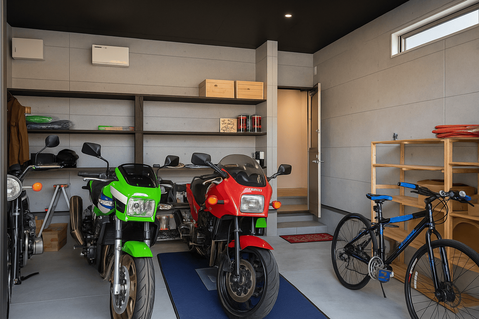バイクや自転車を安心して保管できるインナーガレージは、趣味を楽しむ大人の秘密基地のような空間です。広々とした間口と十分な収納棚を備え、メンテナンス作業も快適。雨や風を気にせず愛車を管理でき、工具やアウトドア用品の整理にも便利です。室内から直接出入りできる動線は日常使いにもスムーズで、暮らしと趣味をシームレスにつなぎます。
