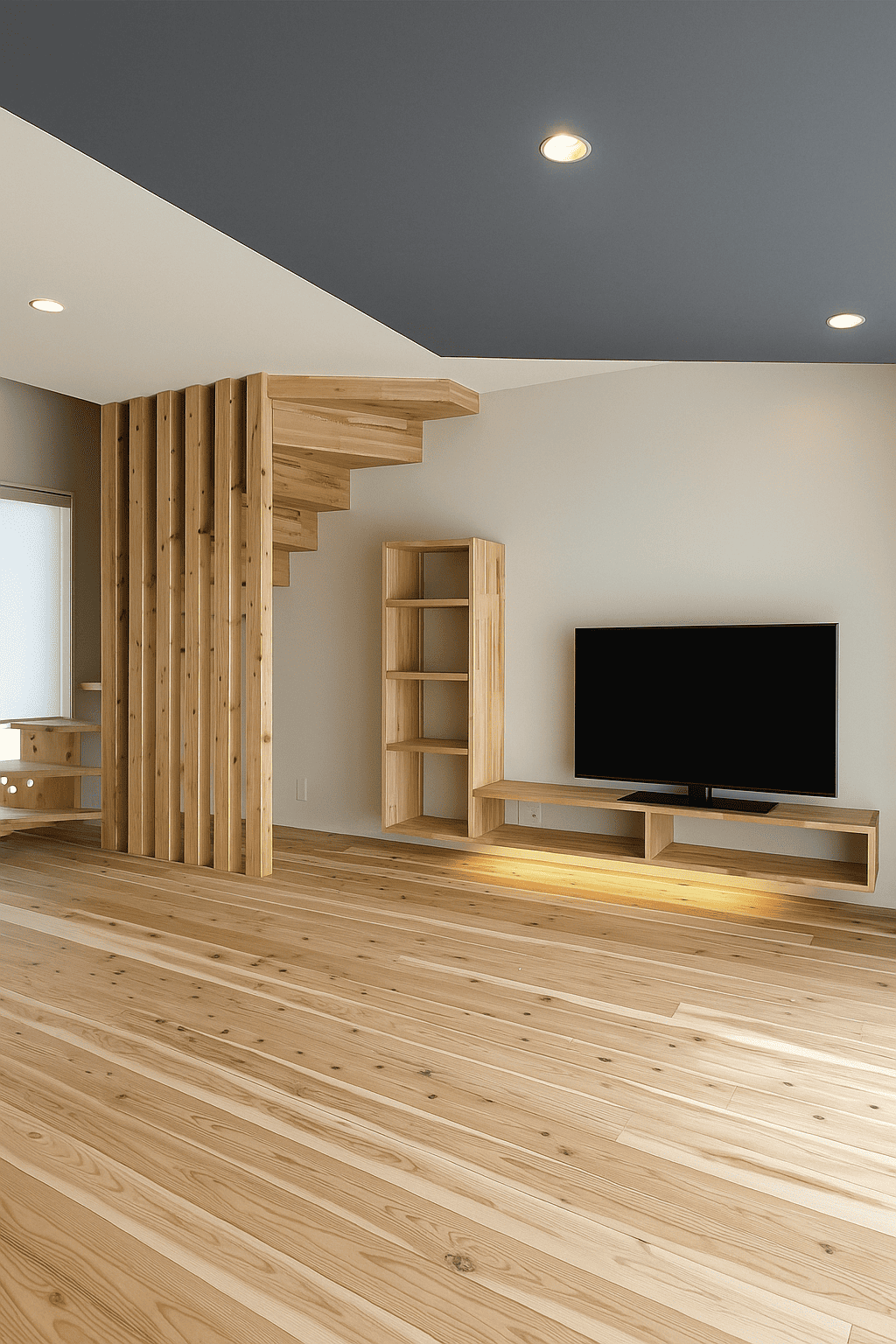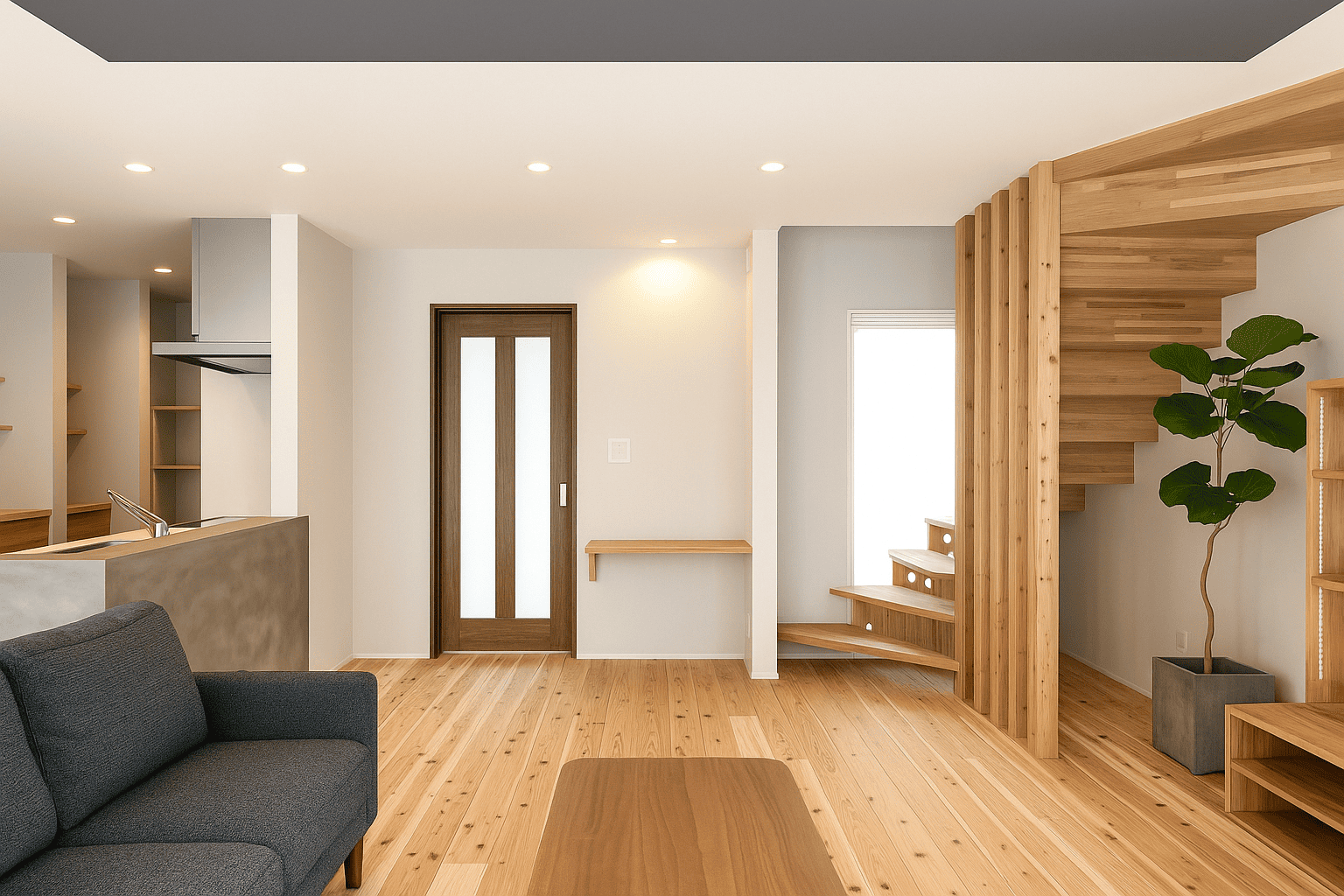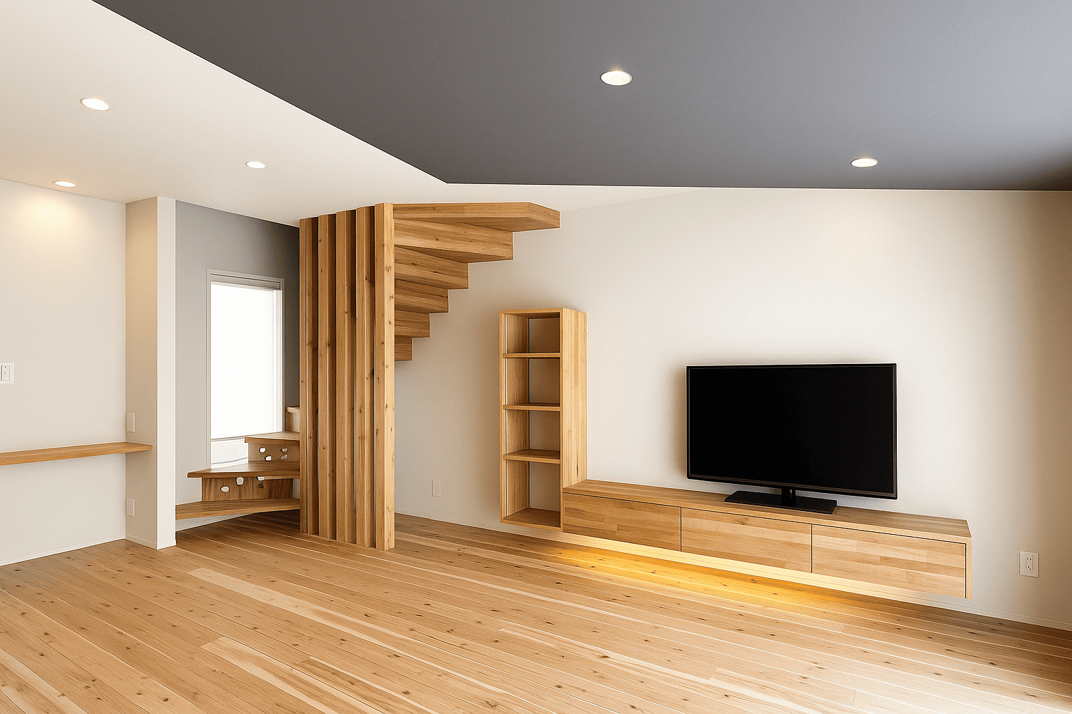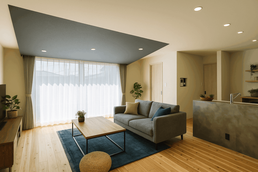 大きな掃き出し窓からやわらかな光が差し込むリビング。無垢フローリングとグレーのアクセント天井が上質な空間を演出します。家族が自然と集まる、居心地の良い団らんスペースです。