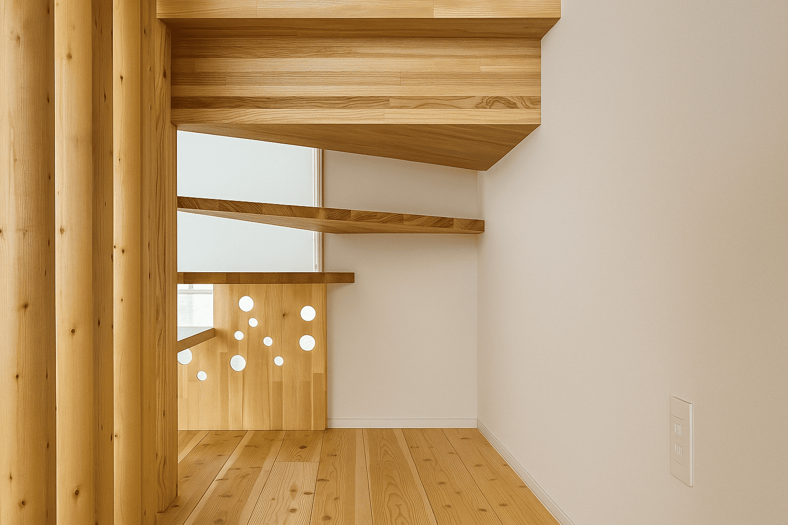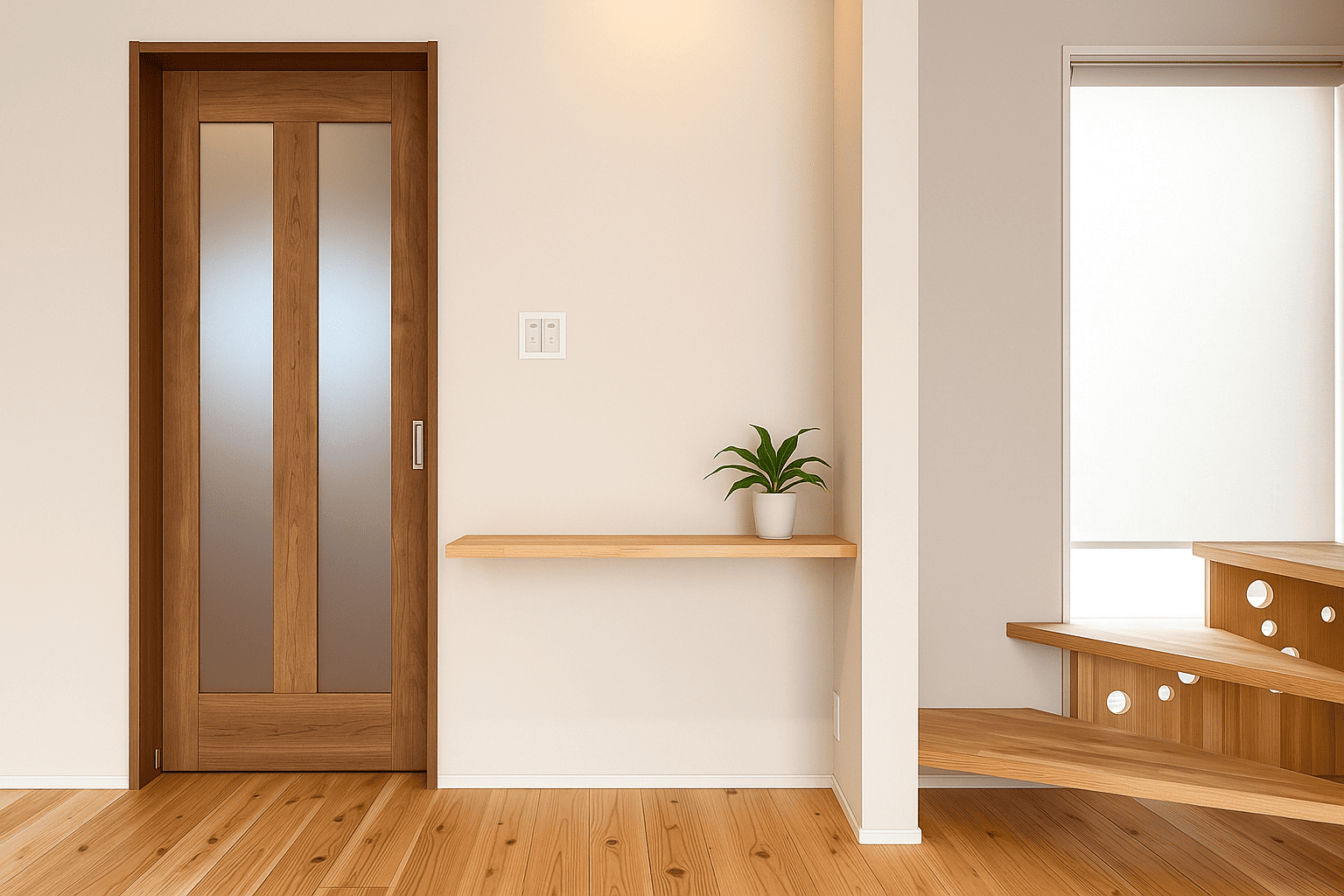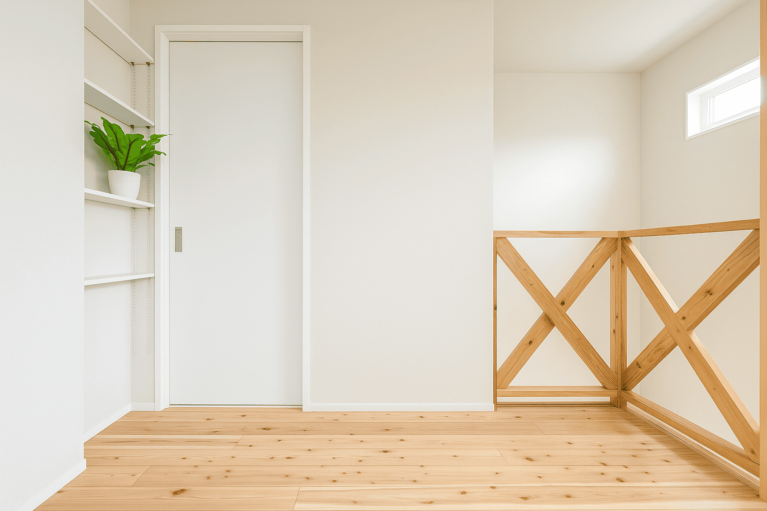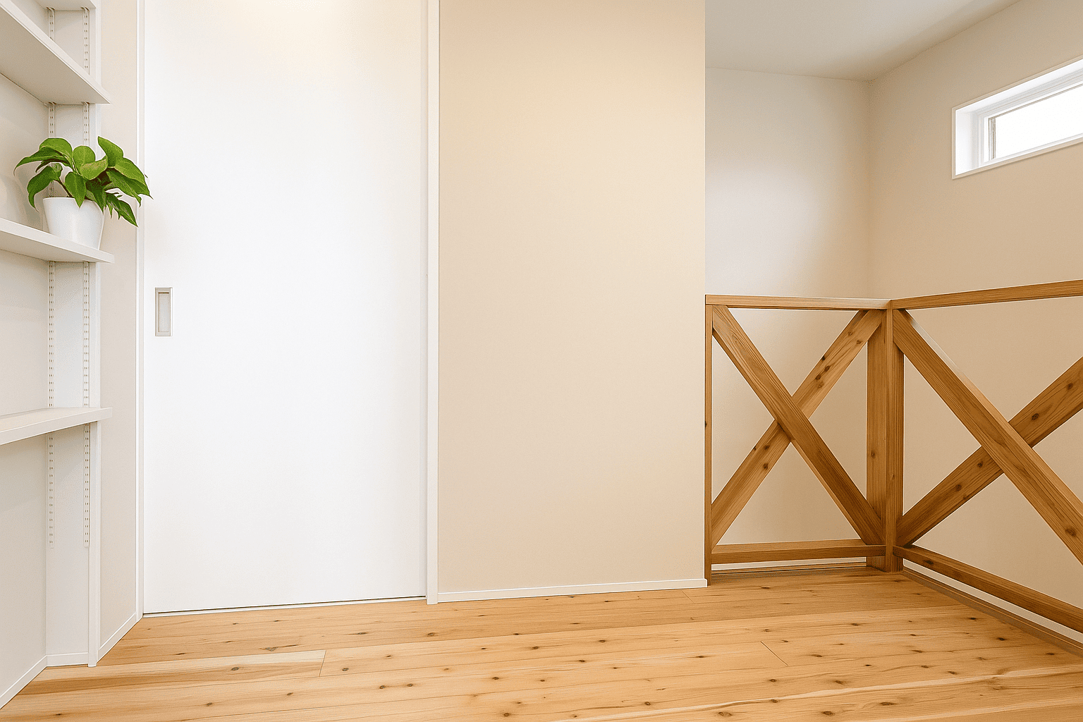 階段を上がった先に設けた、ゆとりのある2階ホール。壁一面の棚は本や小物、家族共有のアイテムをすっきり収納でき、多目的に活用できます。セカンドリビングやワークスペースとしても使える、暮らしに柔軟性をもたらす空間です。