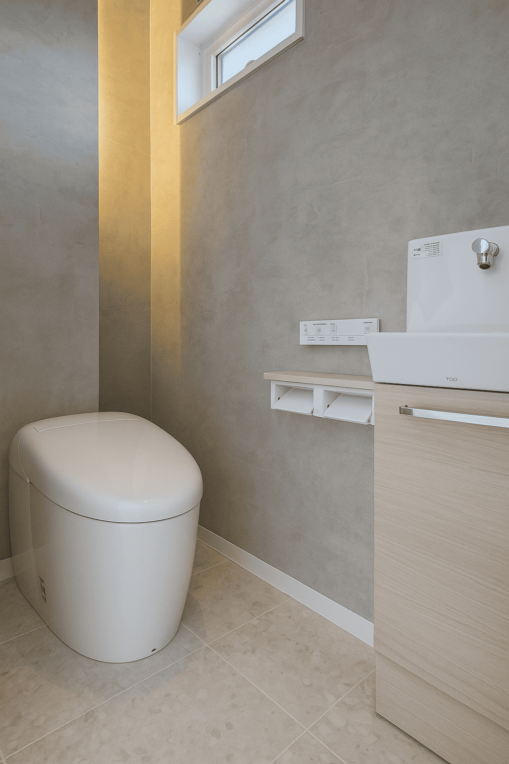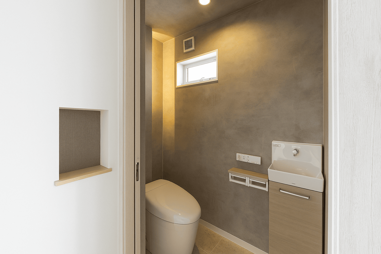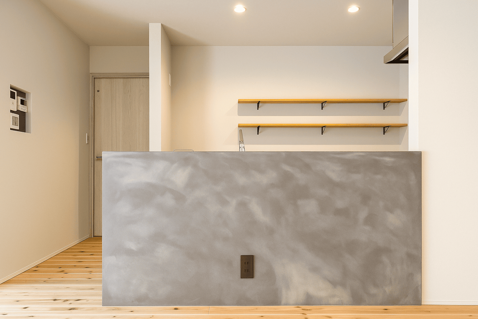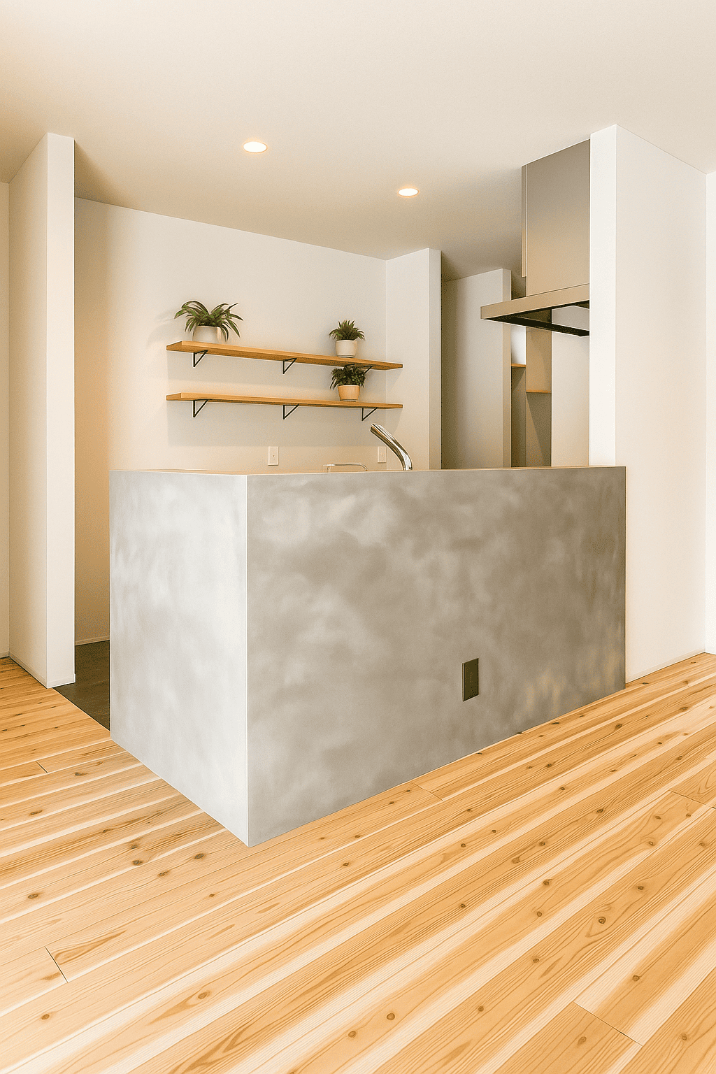 モルタル調の腰壁が印象的な対面キッチン。手元をほどよく隠しながら、リビングとのつながりを確保しています。飾り棚や植物が映える、シンプルで整ったデザインが魅力です。