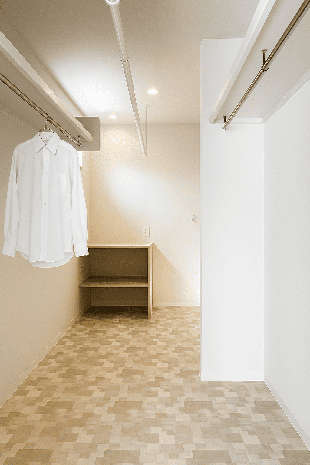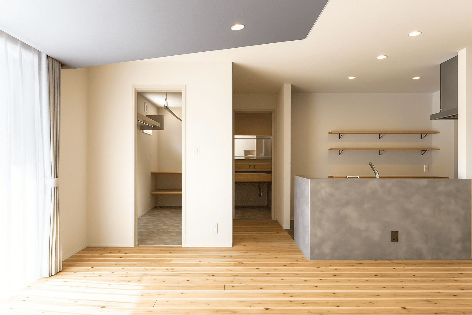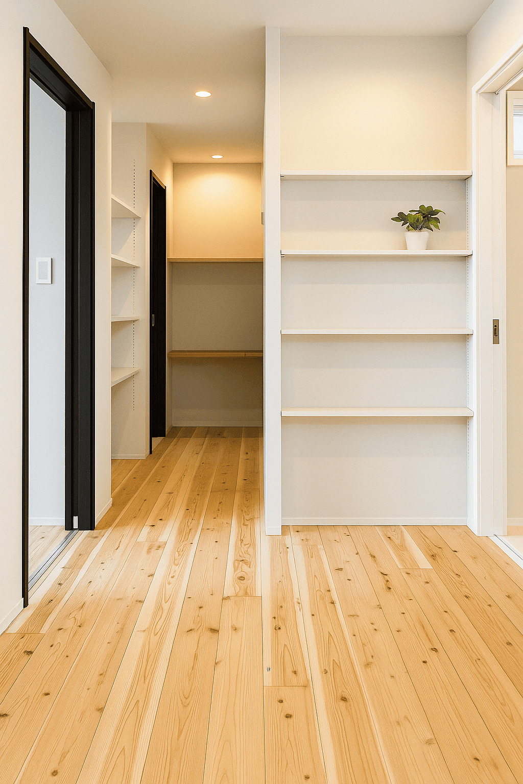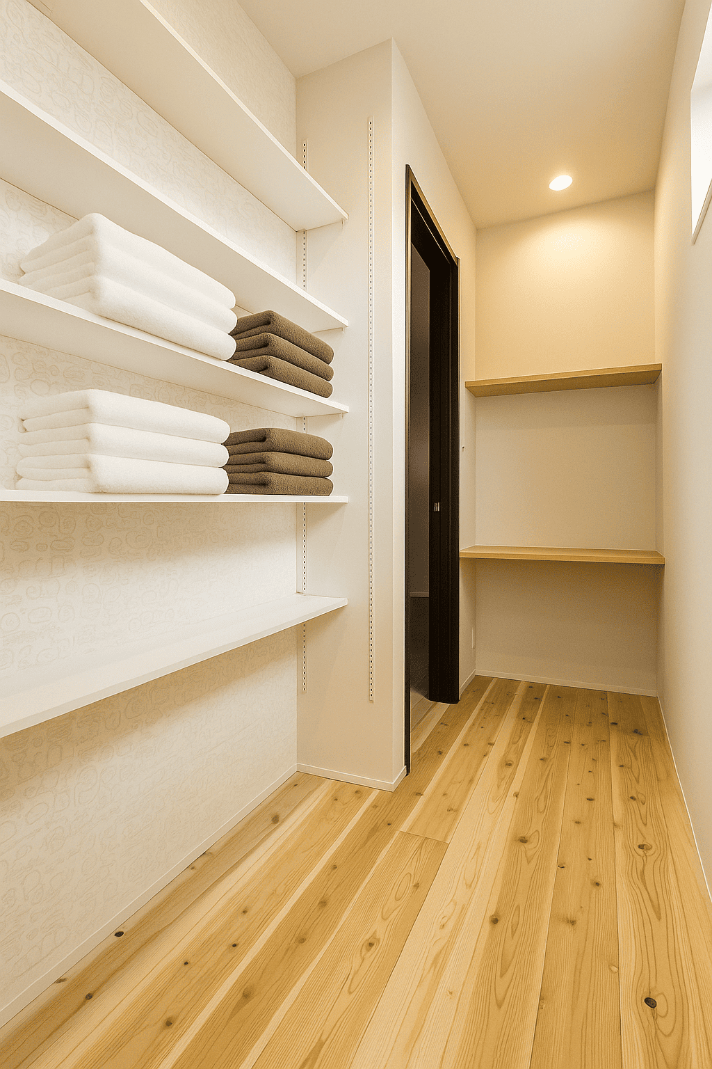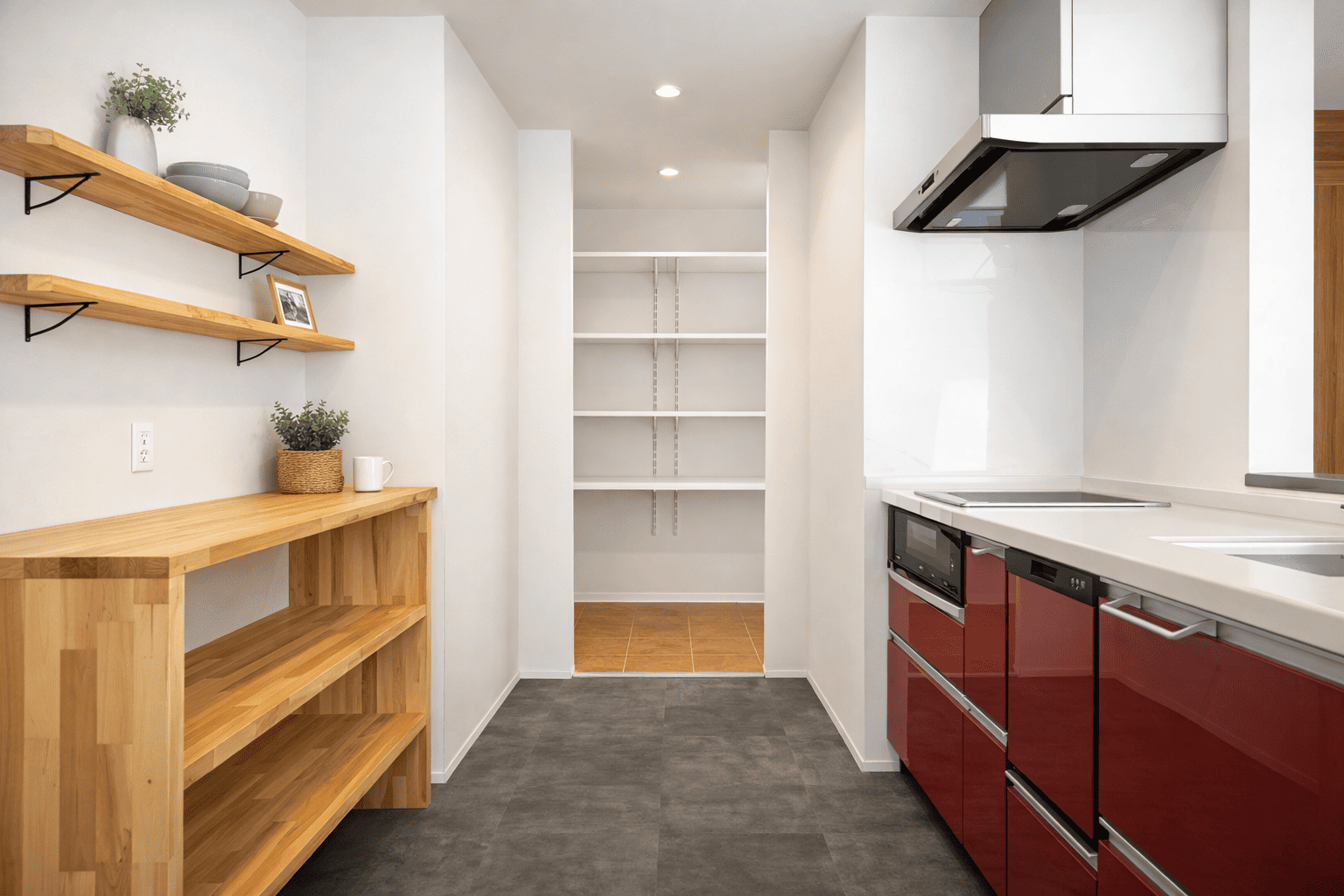 キッチン奥には可動棚付きのパントリーを配置。食品ストックをまとめて管理でき、買い置きも安心です。調理・収納・配膳の動線が短く、毎日の家事を効率よくサポートします。