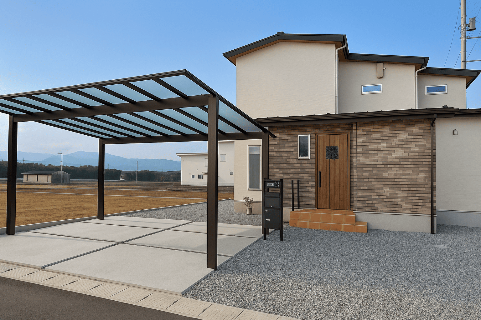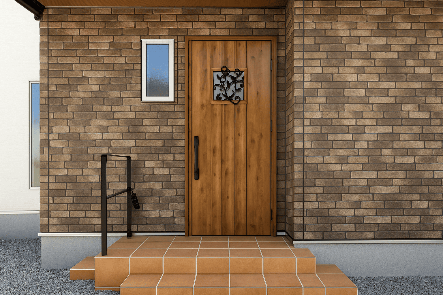 レンガ調の外壁に木目の玄関ドアを合わせ、あたたかみのある表情に仕上げたファサード。タイルポーチと手すり付き階段で出入りも安心。素材感を活かした、落ち着きのある佇まいが印象的です。