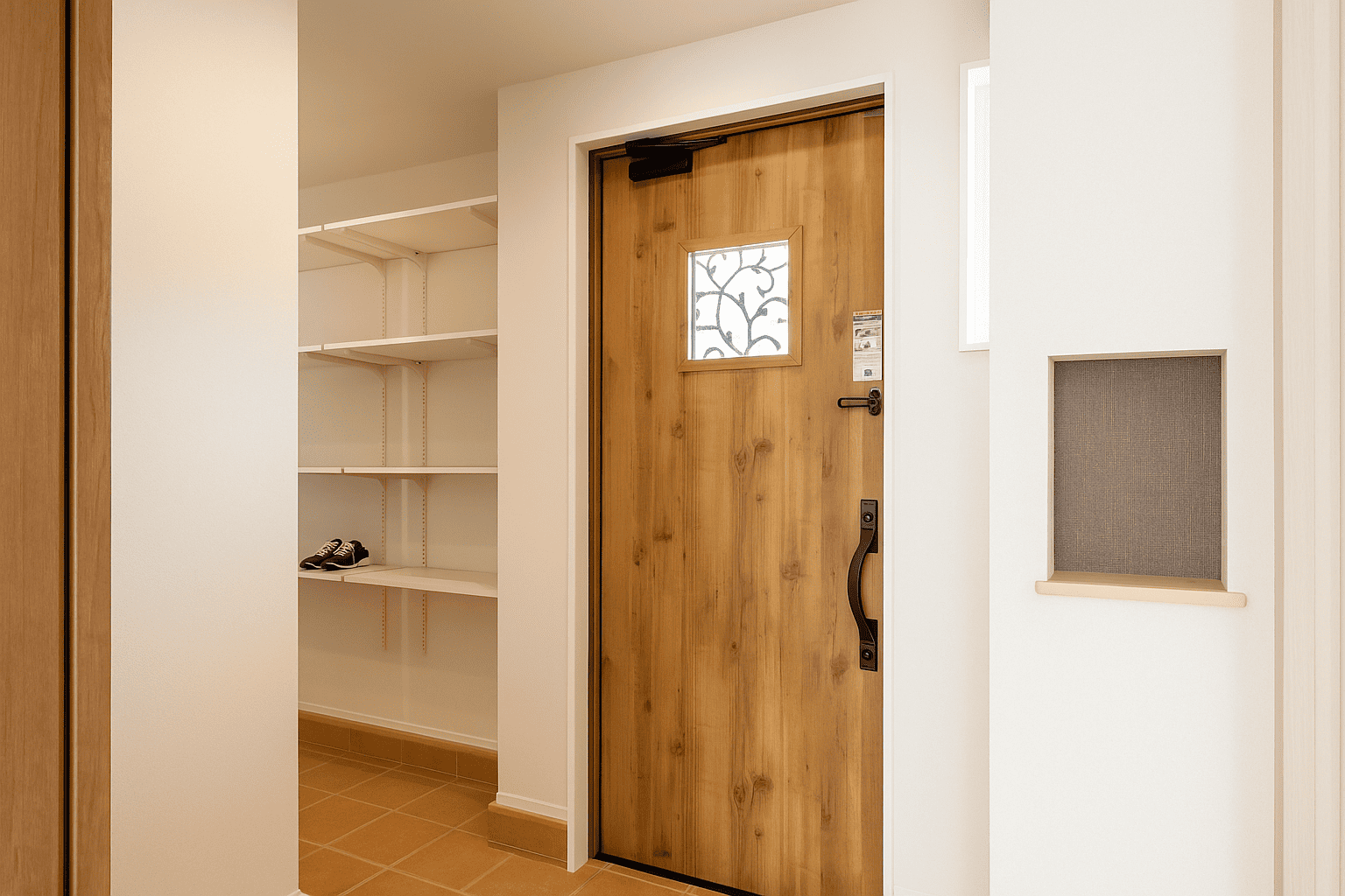 玄関横には土間収納を設置。靴やアウトドア用品、日用品までまとめてしまえるため、玄関まわりがすっきり整います。帰宅後の動線もスムーズで、使い勝手の良さが光ります。